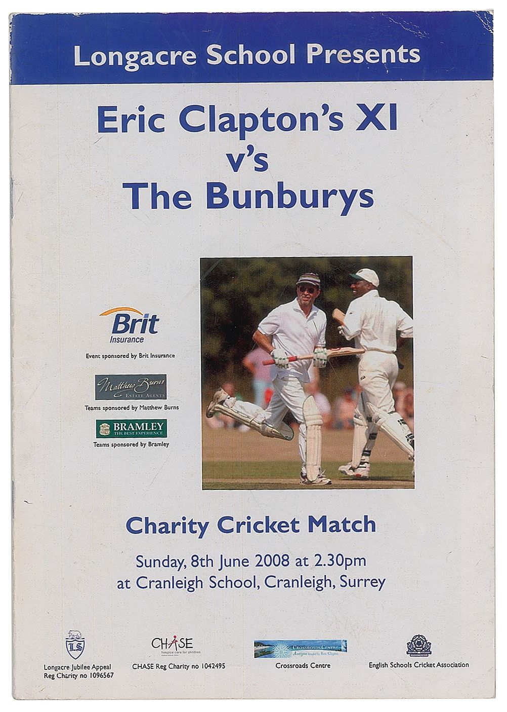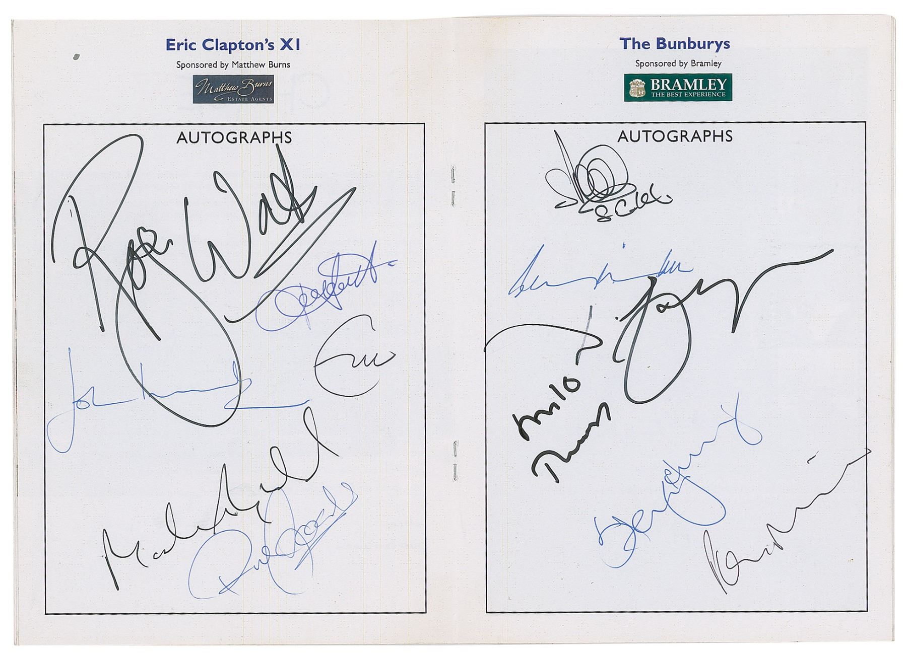 Official program for a charity cricket match between Eric Clapton's XI and The Bunbury's at the Cranleigh School in Surrey on June 8, 2008, 18 pages, 5.7 x 8.25, signed inside in the dedicated autograph section in black ink by Eric Clapton and in black felt tip by Roger Waters. In fine condition, with light handling wear.