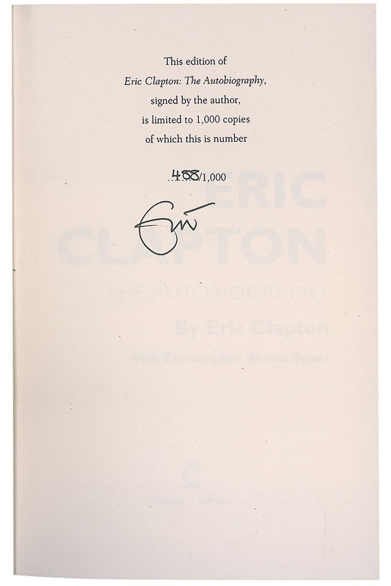 Signed book: Eric Clapton: The Autobiography. Limited edition, first edition, #488/1000. London: Century, 2007. Hardcover with slipcase, 6.25 x 9.5, 392 pages, signed in black felt tip on the limitations page. In fine condition, with some light rubbing to front cover.