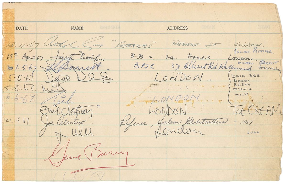 Vintage ballpoint signature, “Eric Clapton, London, The Cream,” on an off-white 9 x 5.75 registry sheet. Also signed by Dave Dee and two members of his band, and Lulu. Other signers have dated the sheet May 1967. In very good condition, with light overall toning, a few dings to the right edge, a toned piece of tape to the left border, and some scattered adhesive remnants above the signature. Accompanied by a full letter of authenticity from Roger Epperson/REAL.