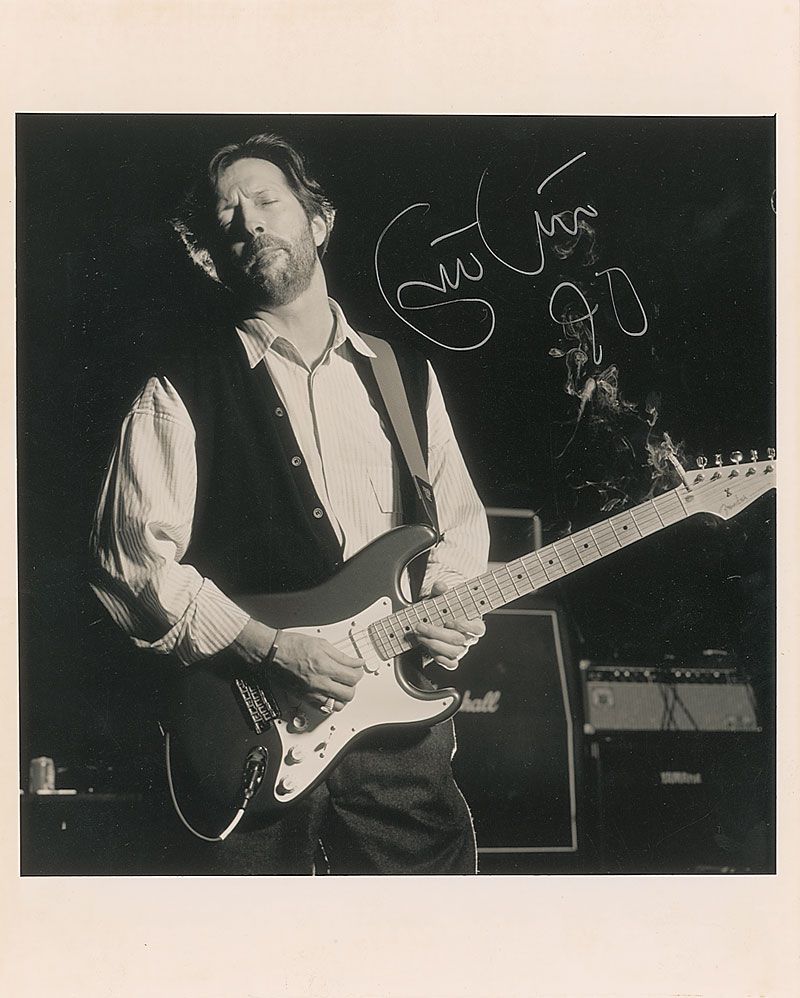 Satin-finish 8 x 10 photo of Clapton hitting a note on his Stratocaster, signed in silver ink, “Eric Clapton 90.” In very fine condition.