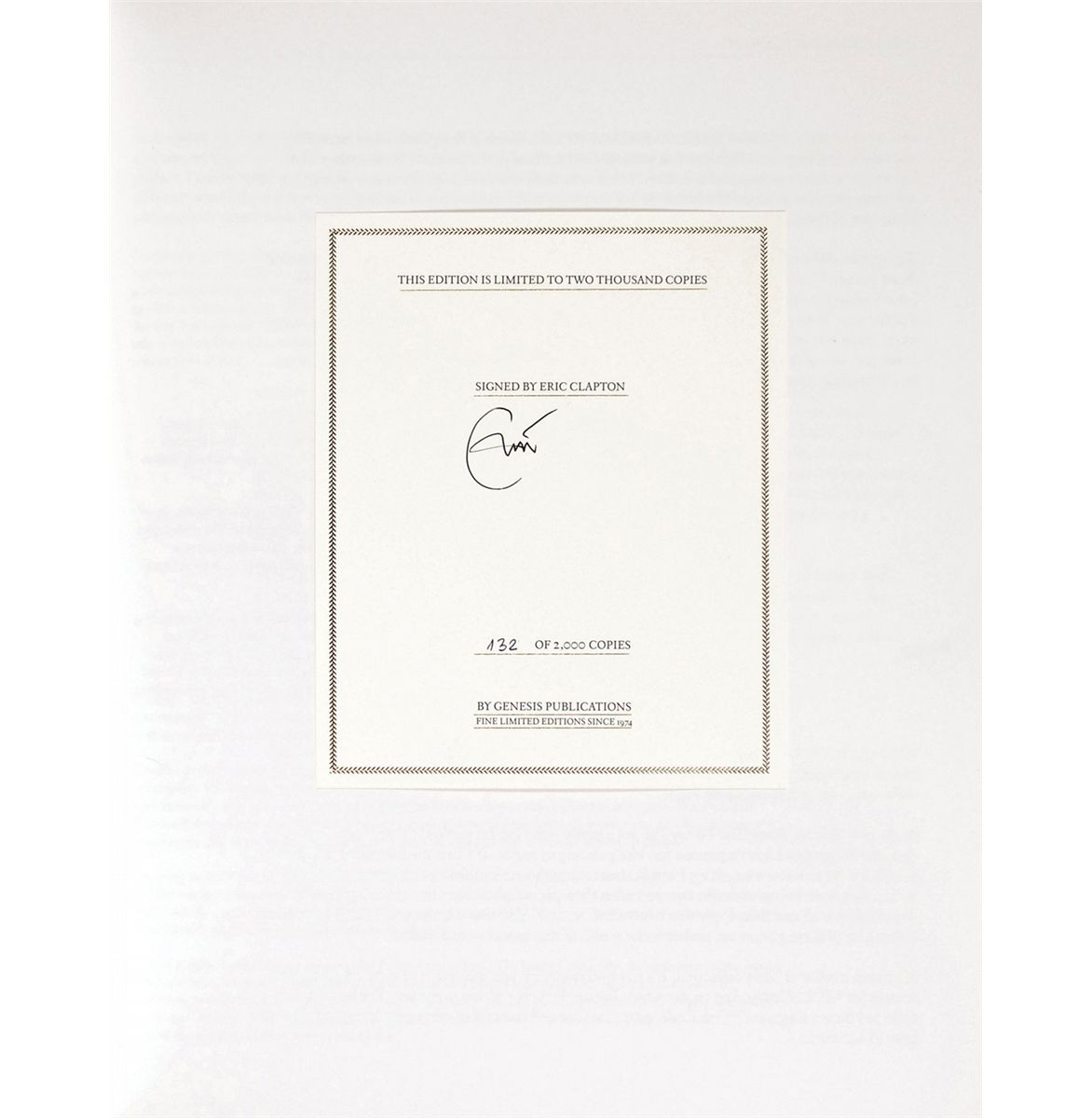Signed book: Six String Stories: the Crossroads Guitars. Deluxe limited edition of 2000 copies (this being No. 132). Guildford, England: Genesis Publications, 2012. Leather and wood with veneer finish in a custom felt-lined case, 10 x 13, 376 pages. Signed in black ink on a bookplate affixed to the colophon and is accompanied by its unsigned Clapton print. Book is housed in its cloth bag and original shipping box. In very fine condition.