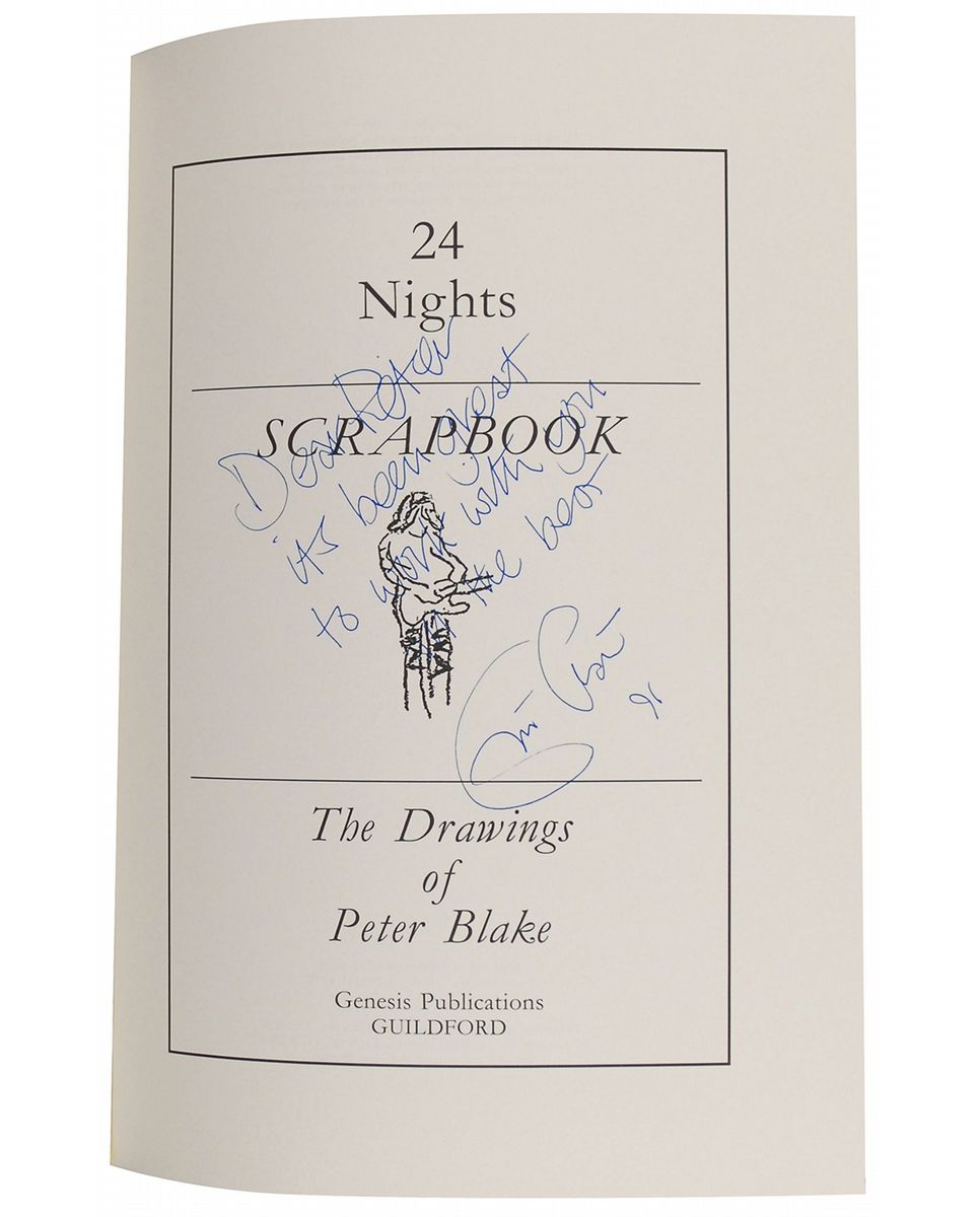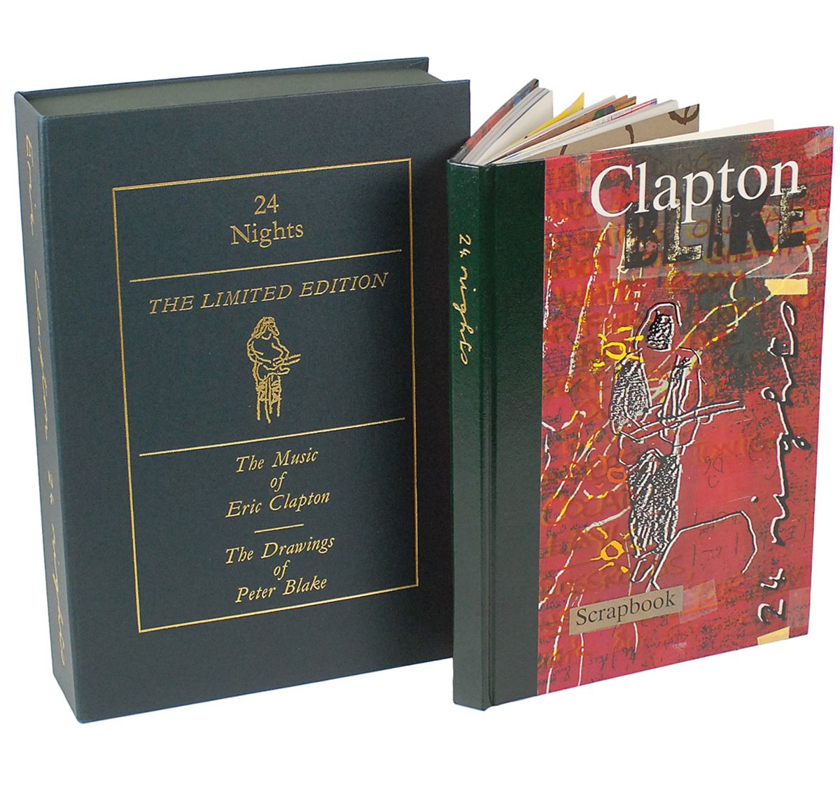 Signed book: 24 Nights. Limited edition of 3500 copies (this being No. 2347) presented in a clamshell box. England: Genesis Publications, 1991. Hardcover ‘scrapbook,’ 8.5 x 12. Signed on the colophon in the scrapbook blue ink, “Eric Clapton 91,” and in black ink by Peter Blake. The other components present include a second book, two CDs, four guitar picks, a ‘badge’ button, backstage passes. and a guitar string. In very fine condition.