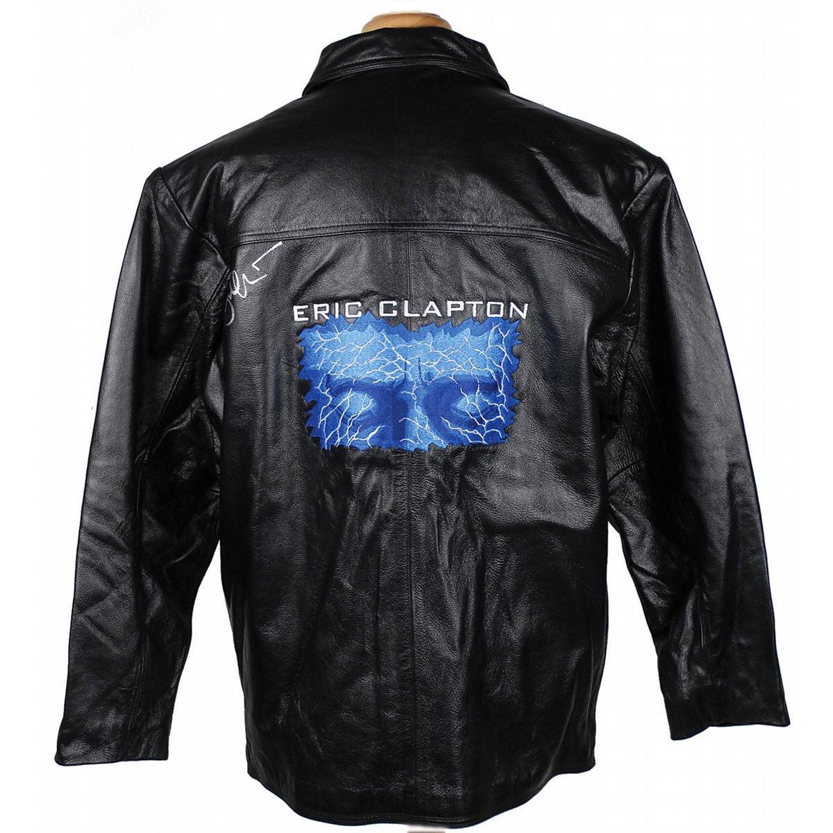 Black leather tour jacket from Clapton’s 1988 Pilgrim tour. The jacket, size large, features an embroidered design on the back, a zip-up front and bears an Outbrook manufacturer’s label in the collar. Signed on the back in silver ink by Clapton. In fine condition. Accompanied by a photo taken at time of signing as well as a full letter of authenticity from Roger Epperson/REAL.