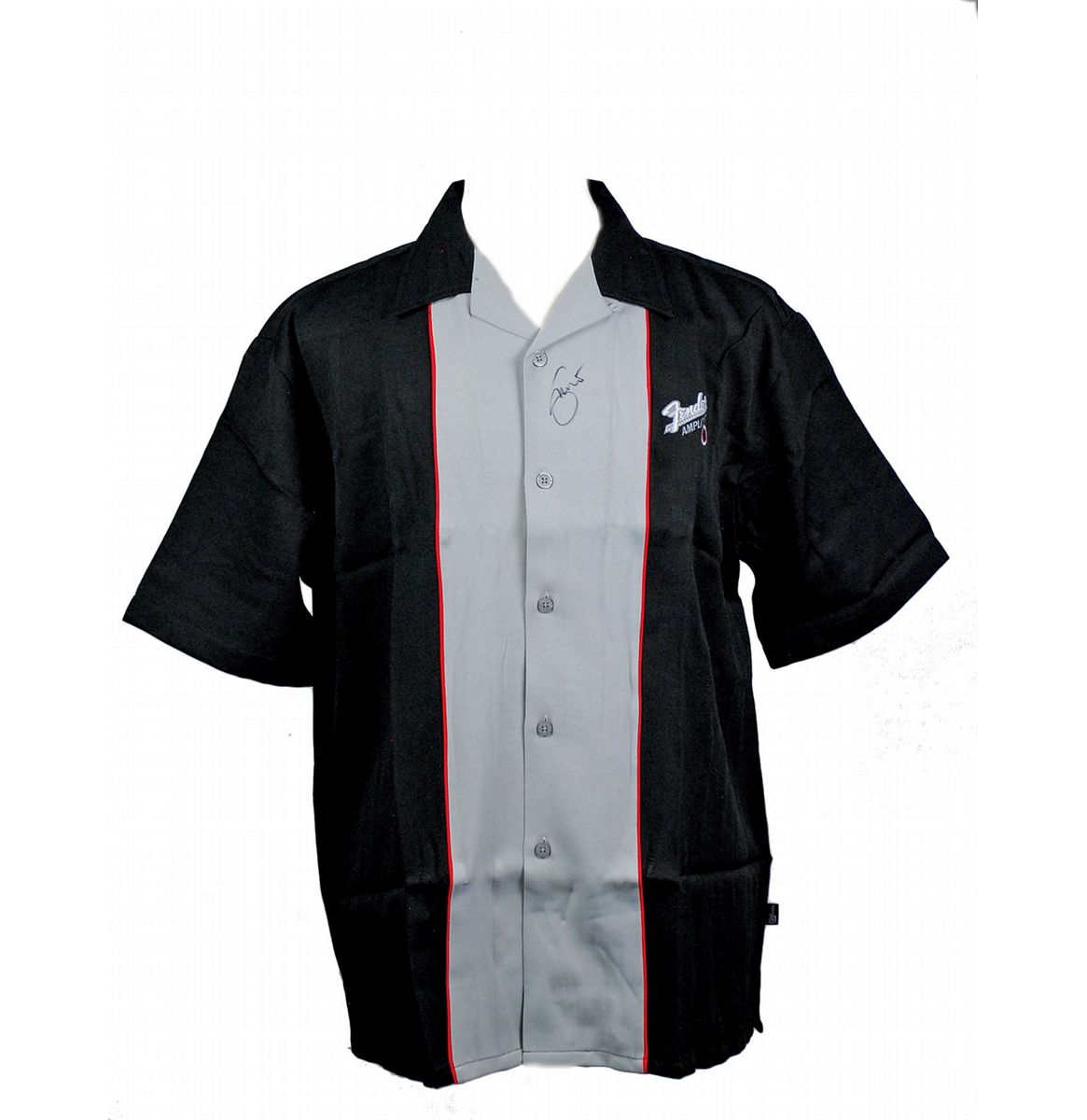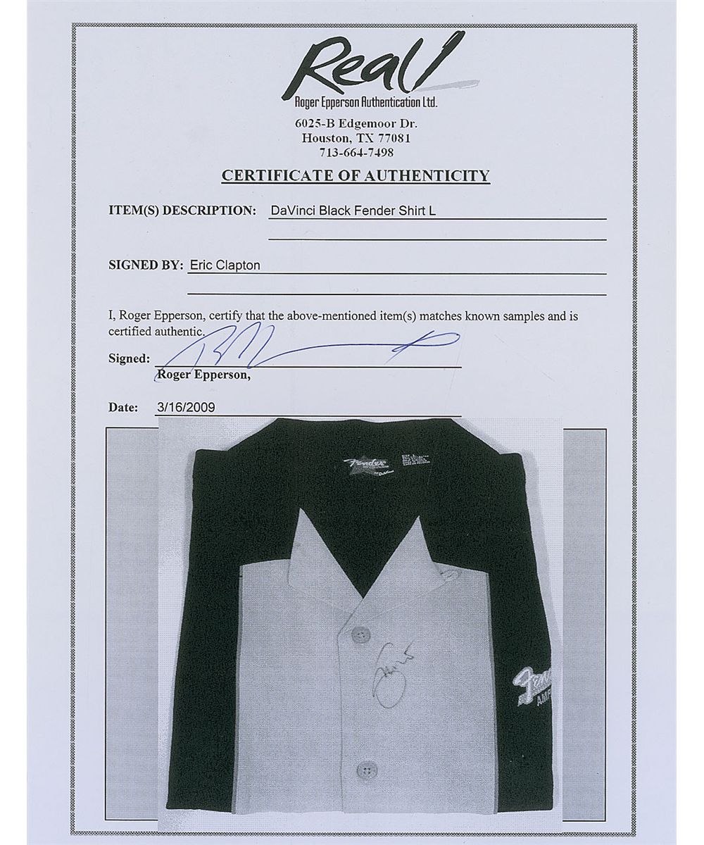 Black and gray Fender amplifier shirt by DaVinci, with a 5-button front and an embroidered logo to the left breast, signed on the front in black felt tip by Clapton. In fine condition. Accompanied by a full letter of authenticity from Roger Epperson/REAL.