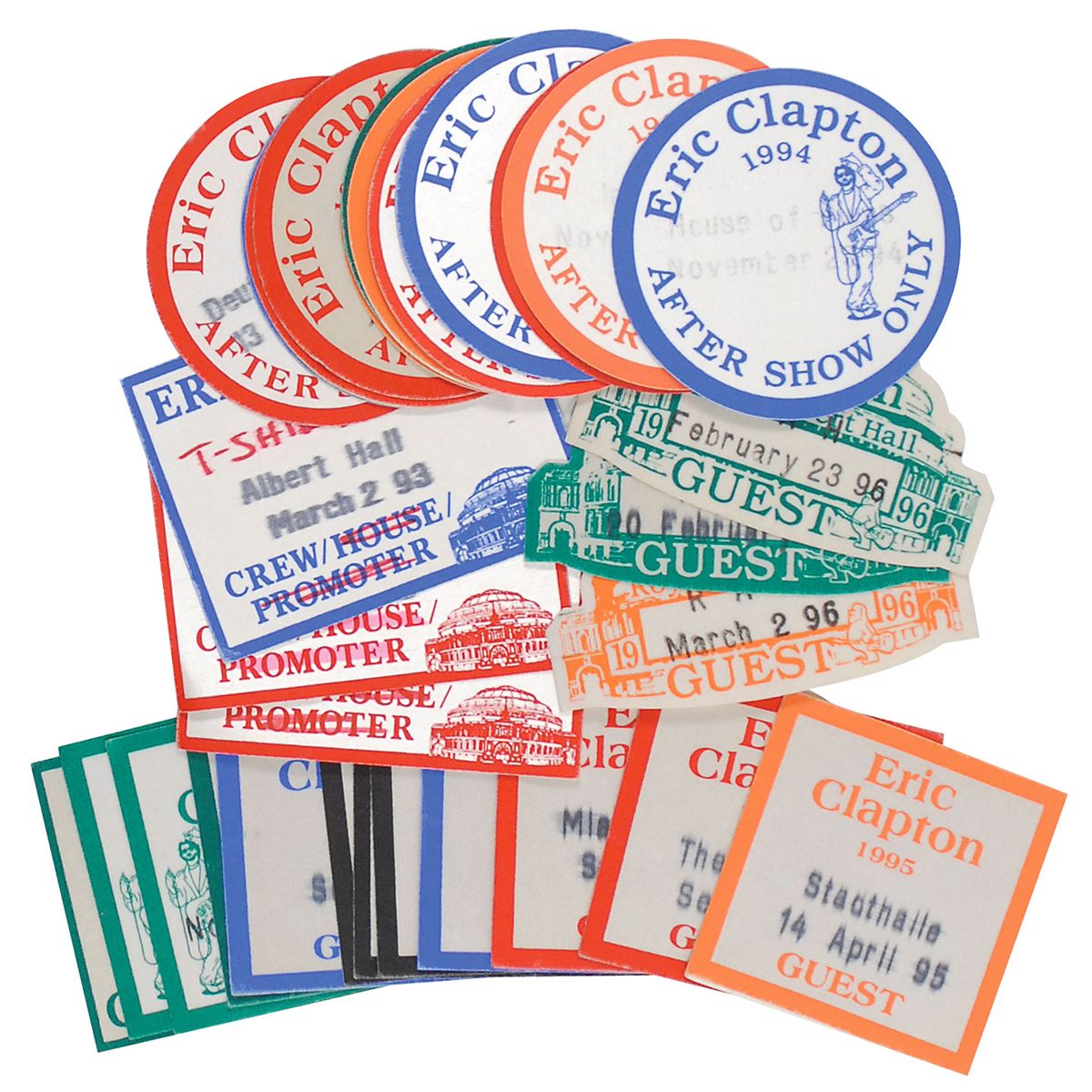Collection of 30 unused backstage passes, various shapes and sizes, for Clapton tours dating from 1993–1997. Most are “after show only” with a few guest and crew passes as well. Venues include Royal Albert Hall, Madison Square Garden, the House of Blues, as well as locations in Nagoya, Seoul, and Budokan. In fine condition.