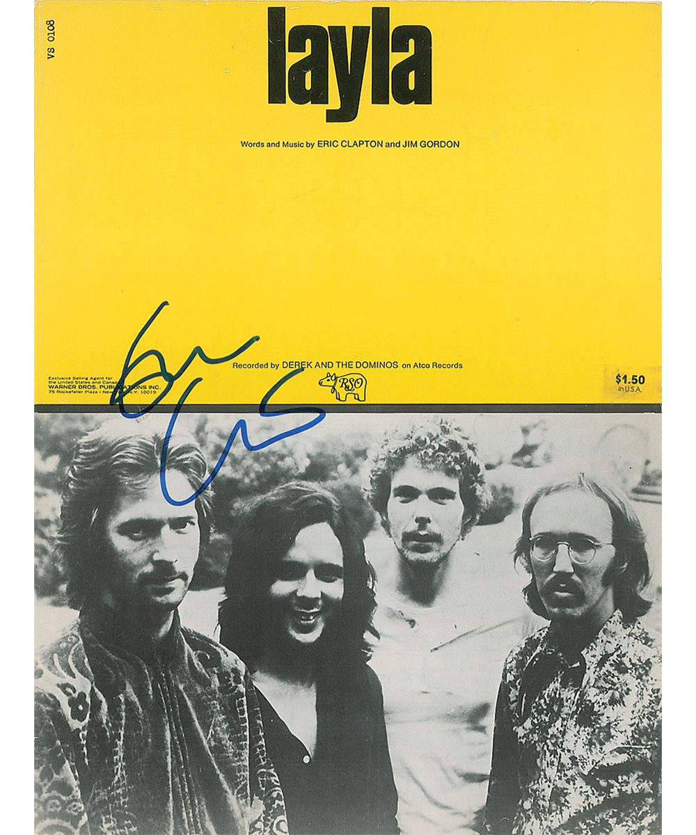 Sheet music to ‘Layla,’ 9 x 12, four pages, signed in person on the front cover in blue felt tip by Clapton. In fine condition, with small area of adhesive remnant along right edge of front cover.