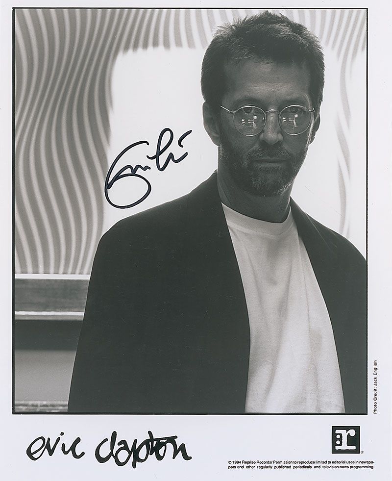 Uncommon satin-finish 8 x 10 Reprise Records publicity photo of Clapton from 1994, nicely signed in black felt tip. In fine condition, with light scattered surface creases.