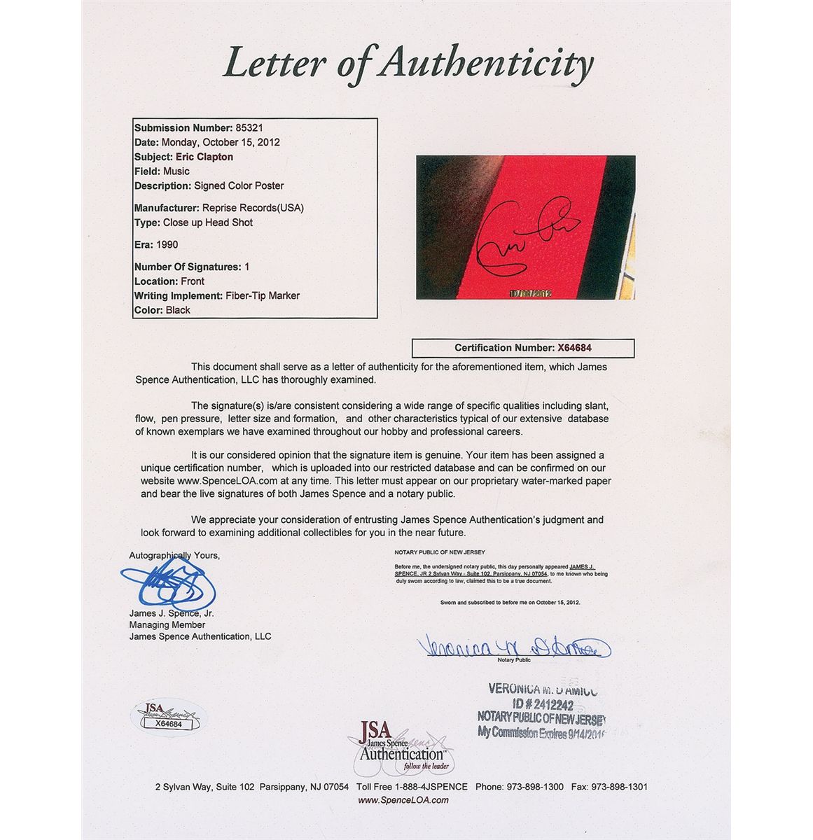 Color 22.5 x 35 poster of Clapton wearing cool sunglasses, signed in black felt tip. Framed to an overall size of 26.5 x 38.5. In fine condition. Accompanied by a full letter of authenticity from JSA.