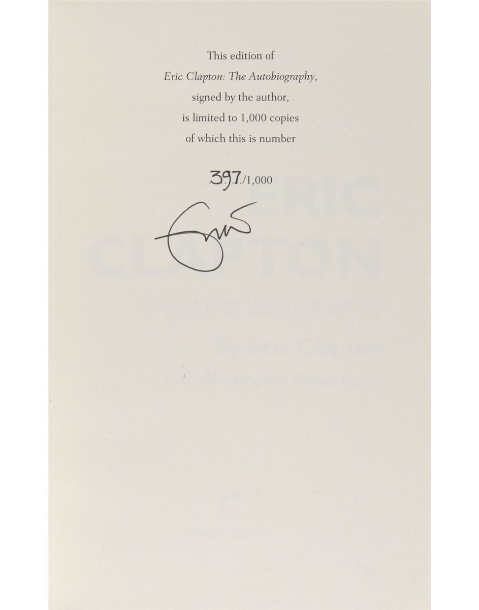 Signed book: Eric Clapton: The Autobiography. First edition, first printing, limited issue, numbered 397/1000. London: Century, 2007. Hardcover with slipcase, 6.25 x 9.5, 392 pages. Signed on the colophon in black felt tip. In very fine condition.