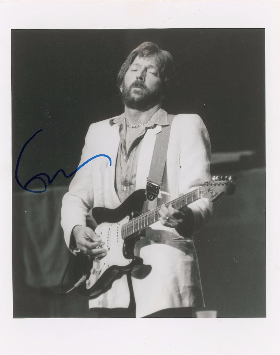 Glossy 8 x 10 photo of Clapton playing his black Fender Stratocaster, signed in blue felt tip. In fine condition, with trivial surface marks.