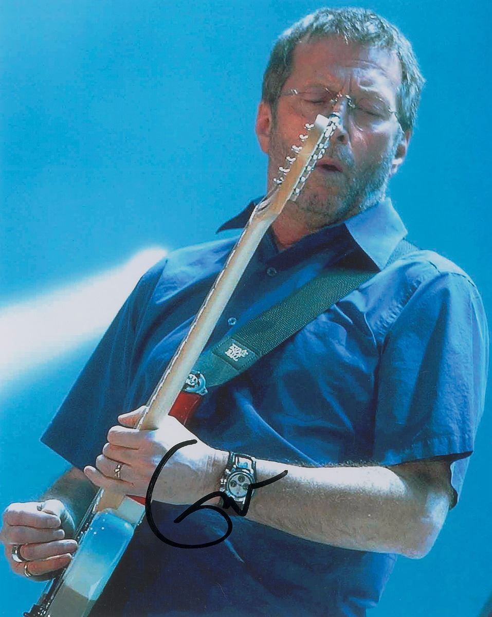 Color glossy 8 x 10 photo of Clapton playing his guitar, signed in black felt tip. In fine condition, with a slightly grainy quality to the image.