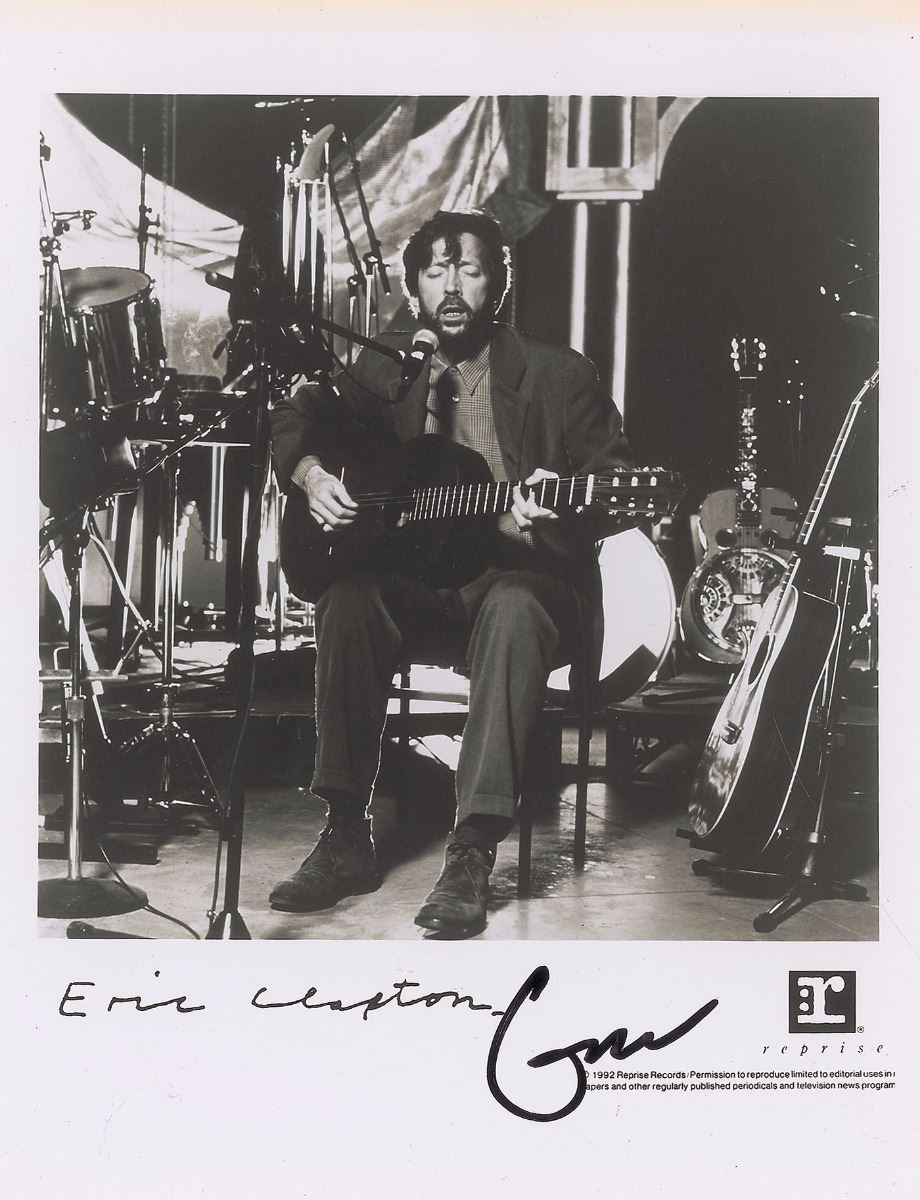 Glossy 8 x 10.25 Reprise Records publicity photo of Clapton playing his acoustic guitar, signed in black felt tip. Photo also bears a pre-printed facsimile signature. In fine condition, with slight toning along top edge and a few trivial stray ink marks.