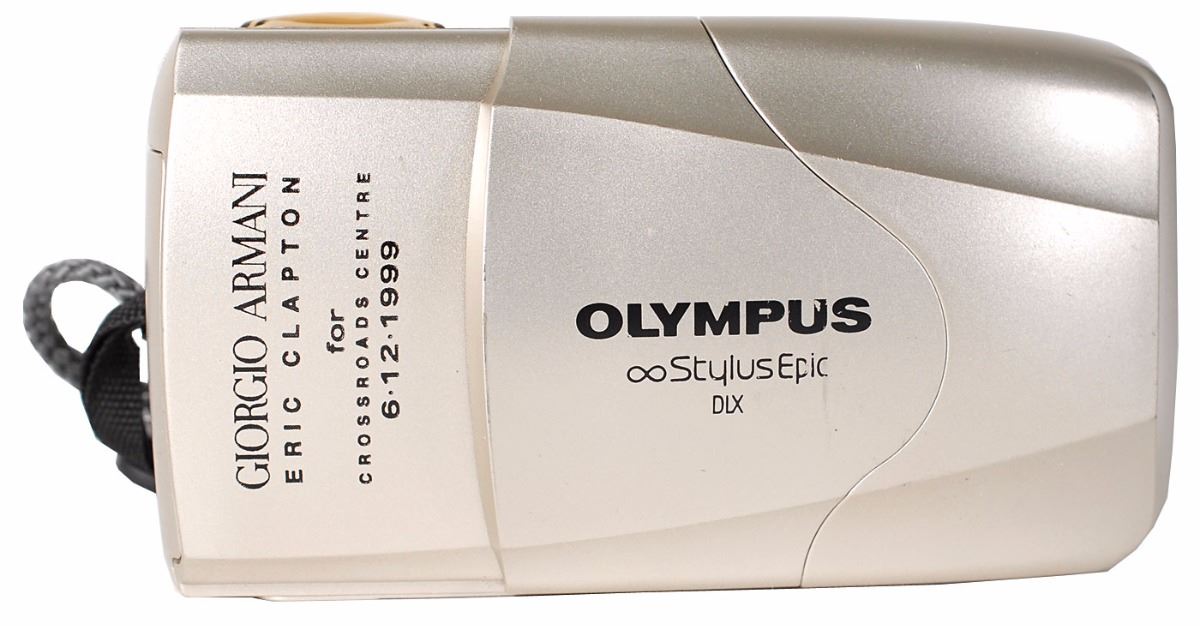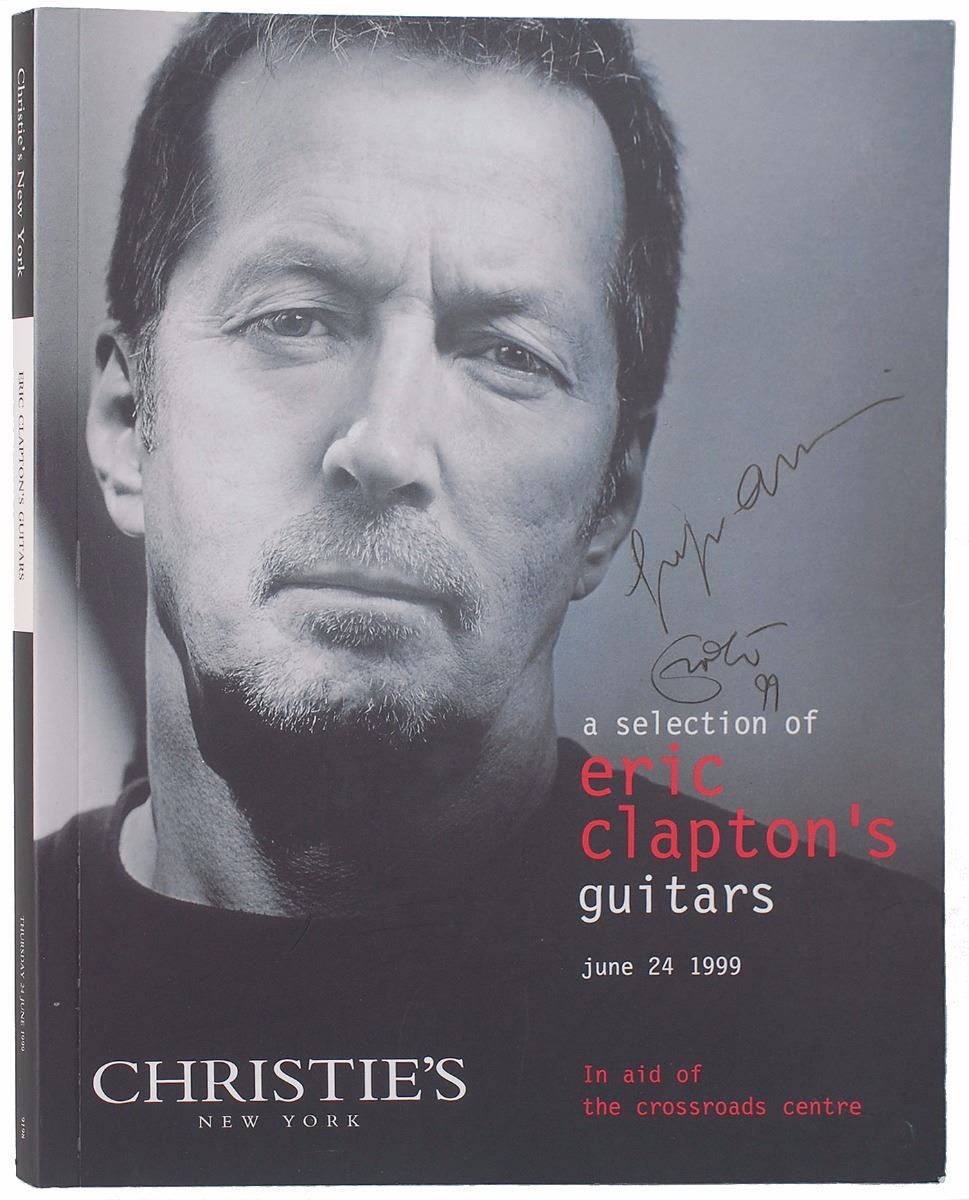 A Selection of Eric Clapton’s Guitars auction catalog for June 24, 1999, held by Christie’s of New York in aid of the Crossroads Center, 8.25 x 10.5, 195 pages, signed and inscribed on the front cover in black ink, “Giorgio Armani, Eric Clapton, 99.” In fine condition. Accompanied by three items from the aforesaid event: a limited edition Olympus Stylus Epic DLX camera, and a pair of laminated staff passes. A decidedly uncommon item that should appeal highly to Clapton collectors.