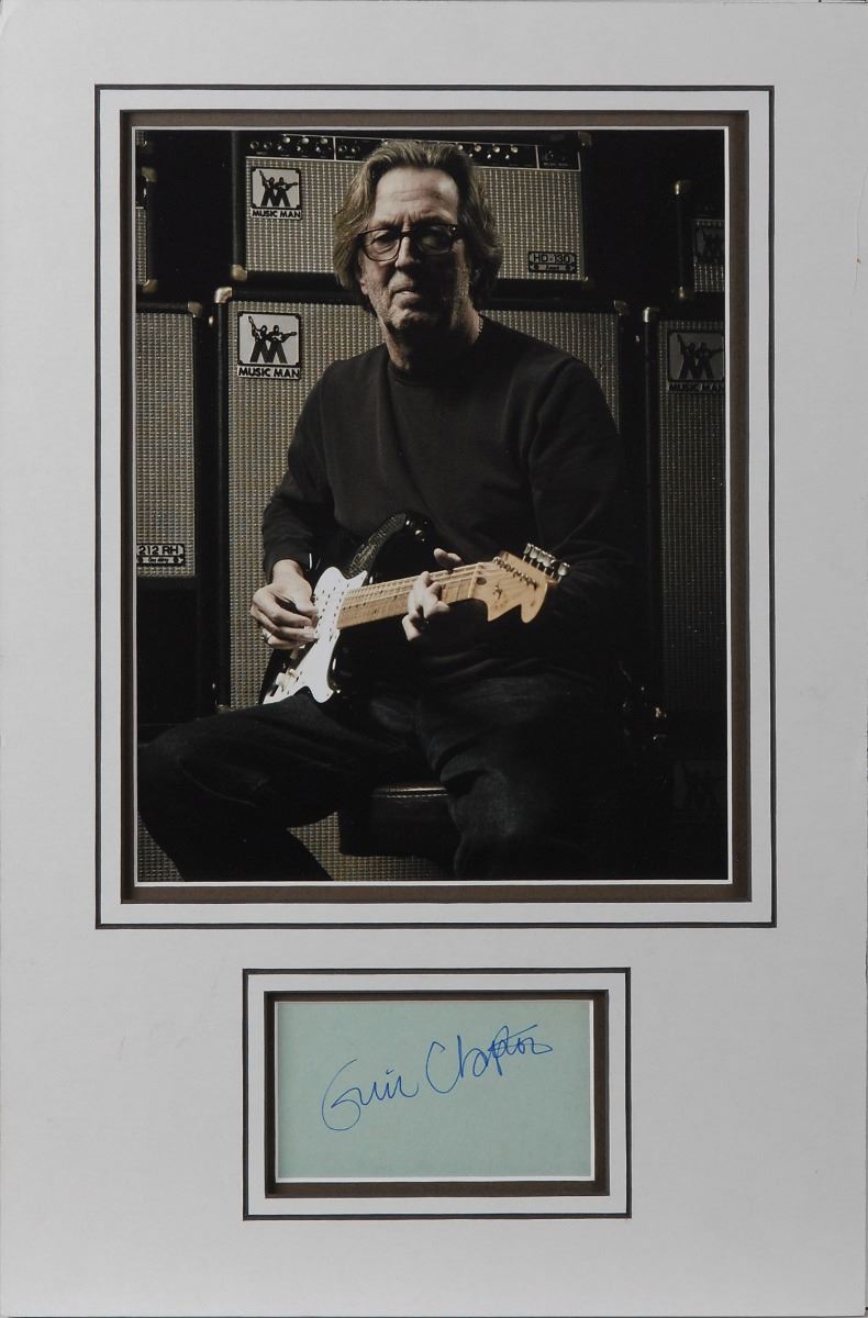 Felt tip signature, “Eric Clapton,” on a light blue 4 x 2.5 card. Double-matted with a glossy photo of Clapton to an overall size of 11 x 16.5. In fine condition.