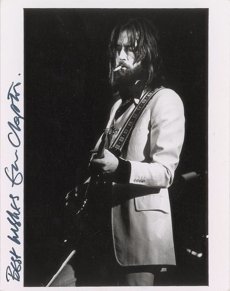 Semi-glossy 8 x 10 silver gelatin photo of Clapton smoking a cigarette and playing his guitar during a performance, signed vertically in the left border in black felt tip, "Best wishes Eric Clapton." Reverse bears a Michael Putland photography stamp. In fine condition, with scattered light creasing. A highly appealing photo with a bold and longer than typically seen signature.