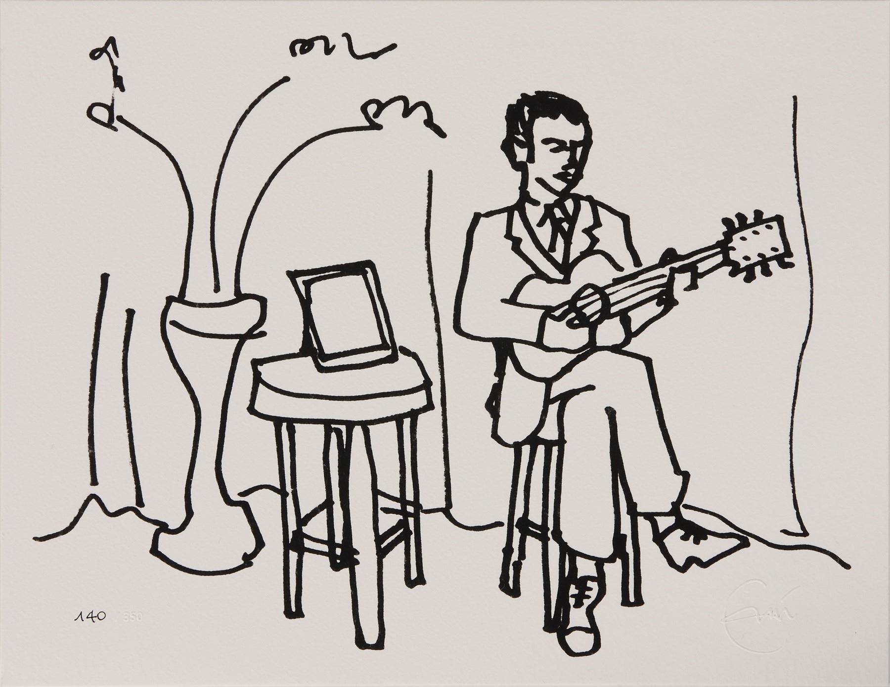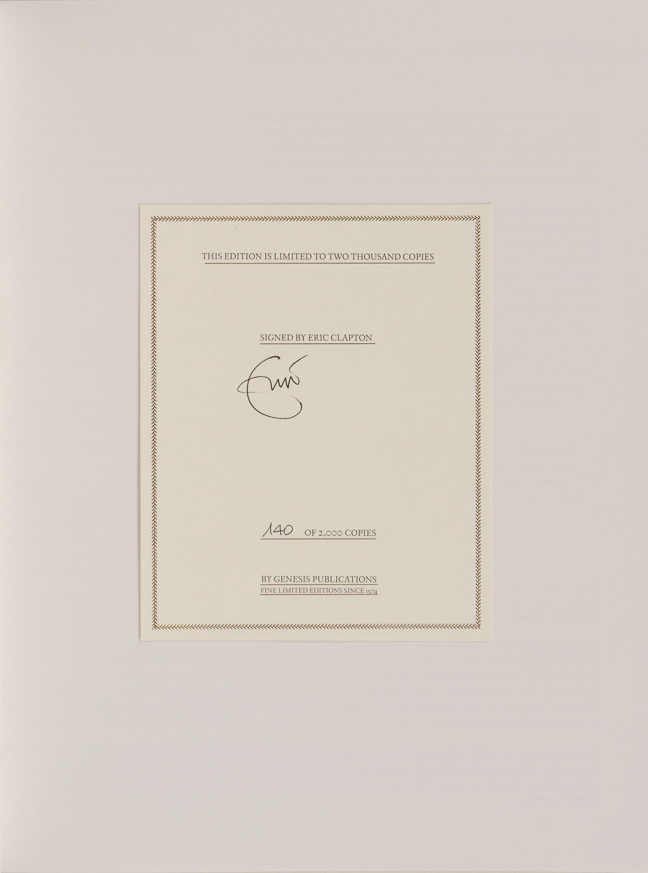 Signed book: Six String Stories. Deluxe limited edition, numbered 140/2000. Guildford, England: Genesis Publications, 2012. Hardcover with clamshell case and cloth bag, 11 x 14, 376 pages. Neatly signed on a bookplate affixed to the colophon in black felt tip. In fine condition. Includes the accompanying fine art giclee print numbered 140/350, as included only with the deluxe edition. Genesis editions are highly sought after and this gorgeous handcrafted edition is simply marvelous.