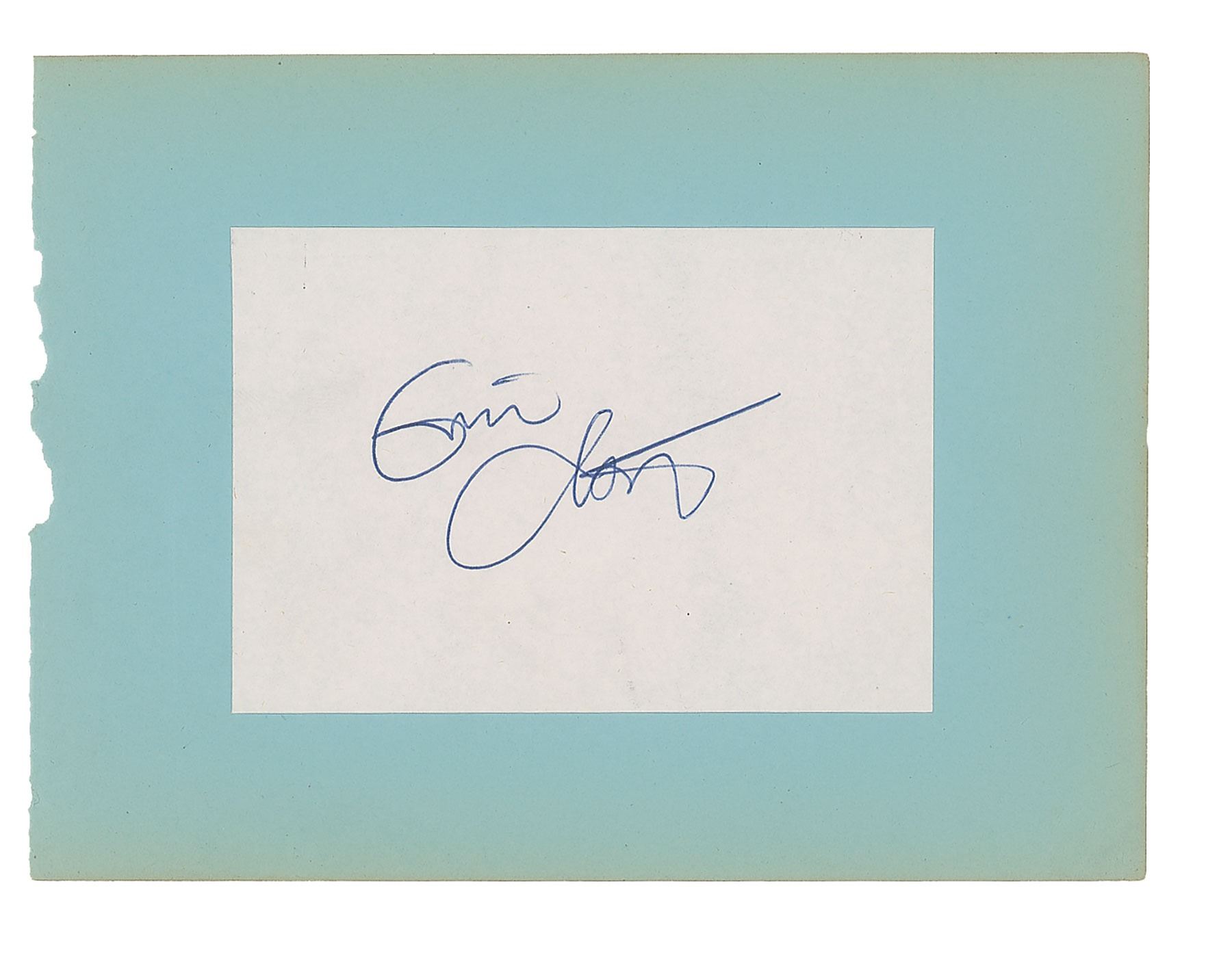 Ballpoint signature, "Eric Clapton,” on an off-white 4 x 2.75 sheet applied to a light blue album page. In fine condition.