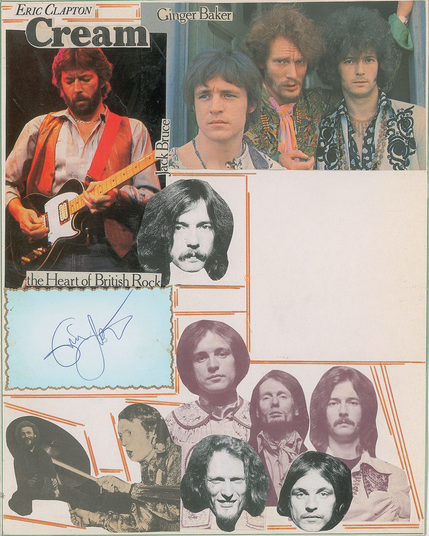 Ballpoint signature, "Eric Clapton,” on a light blue 3.75 x 2.25 card affixed to a 9.5 x 11.75 mount bearing several program and magazine images of Cream band members. In fine condition.
