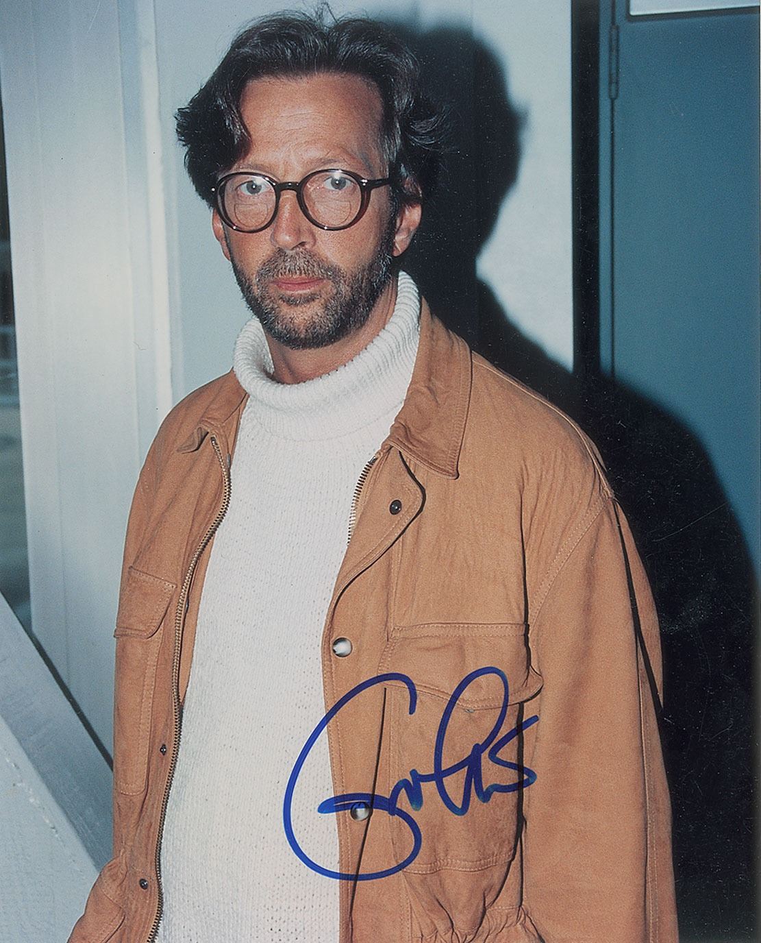 Color glossy 8 x 10 photo of Eric Clapton in a casual half-length pose, signed in blue felt tip. In fine condition.