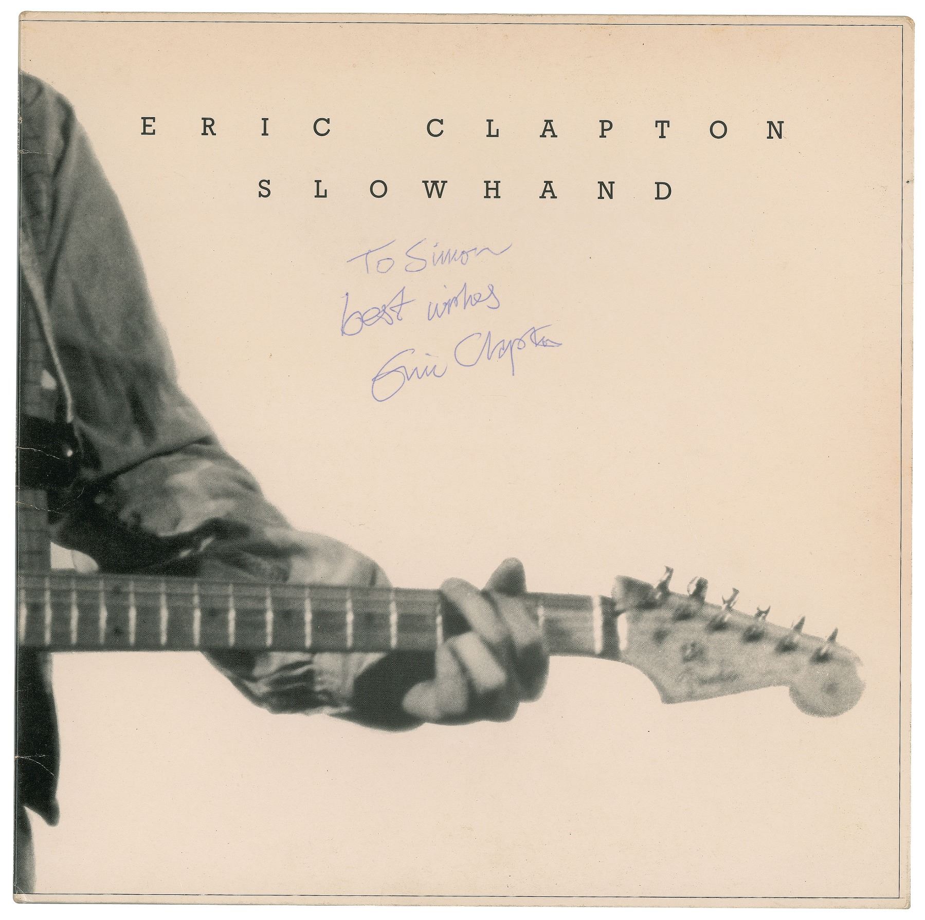 Slowhand album signed and inscribed on the front cover in blue ballpoint, "To Simon, best wishes, Eric Clapton." In fine condition. The record is included. Accompanied by a certificate of authenticity from Tracks.
