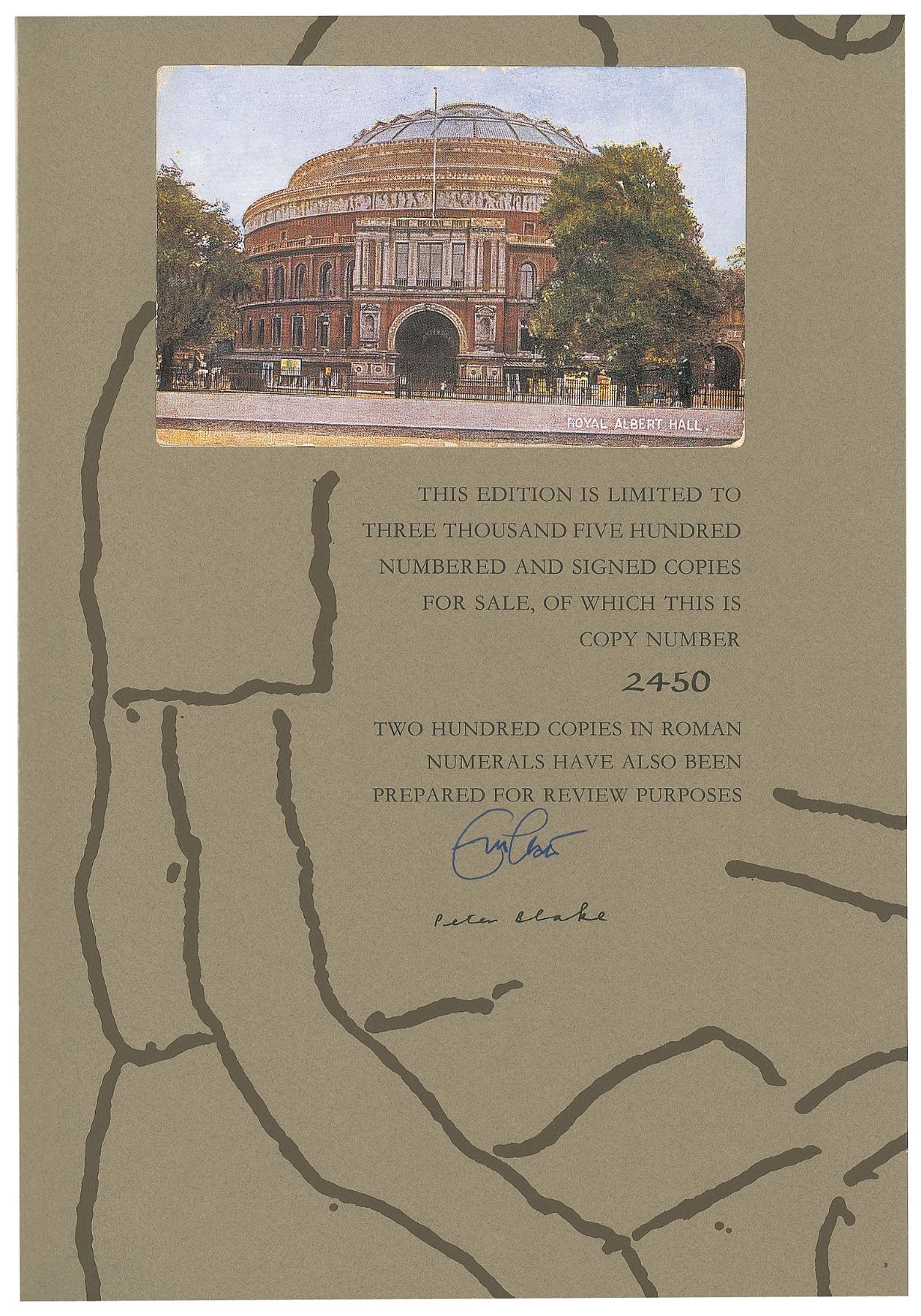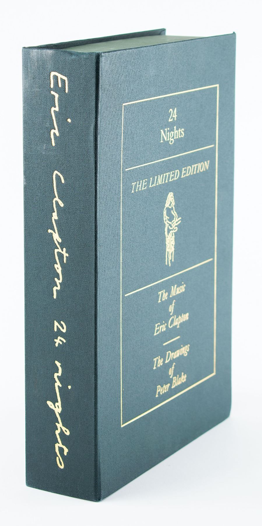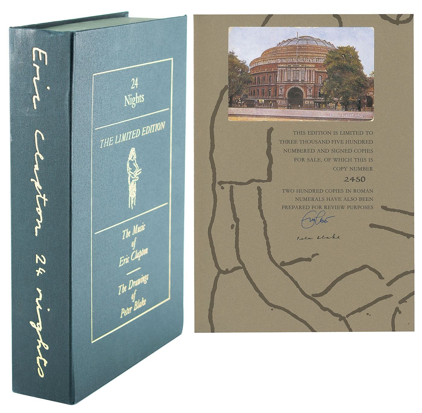 Signed book: 24 Nights. Limited edition, numbered 2450/3500. Surrey, England: Genesis Publications Limited, 1991. Hardcover with clamshell case, 9.25 x 13.5, 128 pages. Signed on the colophon in blue ink, "Eric Clapton," and in black ink by the illustrator, "Peter Blake." The front and back of the title page features printed signatures of Eric Clapton and George Harrison. Includes a 58-page volume of commentary by journalist Derek Taylor, an exclusive two CD set of live recordings, four of Clapton's guitar picks, a laminated backstage pass, a button badge, and an Ernie Ball guitar string. In fine condition, with surface loss and adhesive remnants to opening pages of Taylor commentary. An incredible compilation of music, artwork, and written word, commemorating Clapton's record-setting run of concerts held at London's Royal Albert Hall in 1990 and 1991.