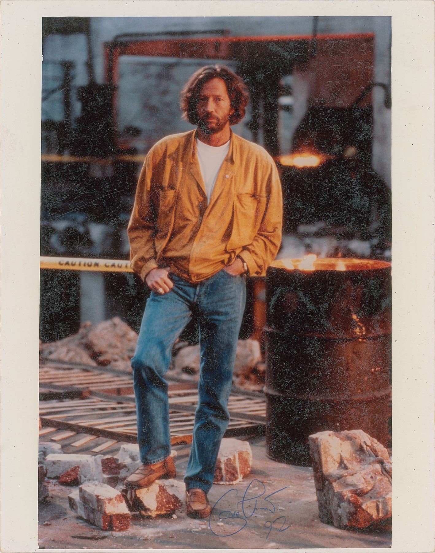 Color glossy 8 x 10 full-length photo of Clapton standing at a construction site, signed in blue ballpoint, "Eric Clapton, 92." In very good to fine condition, with overall light surface scuffing. The year 1992 was a hugely successful one for Clapton, who wrote all the soundtrack music to the movie Rush, and his Unplugged album won six Grammy Awards and sold over 26 million copies; both albums contained the best-selling single 'Tears in Heaven,' which was written about the death of Clapton's four-year-old son, Conor.