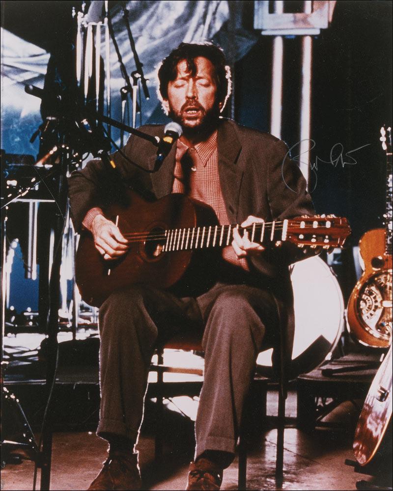 Color glossy 8 x 10 photo of Clapton performing an acoustic number, signed in silver ink. In fine condition, with light bend to lower right corner, and a couple trivial stray ink marks to lower left.