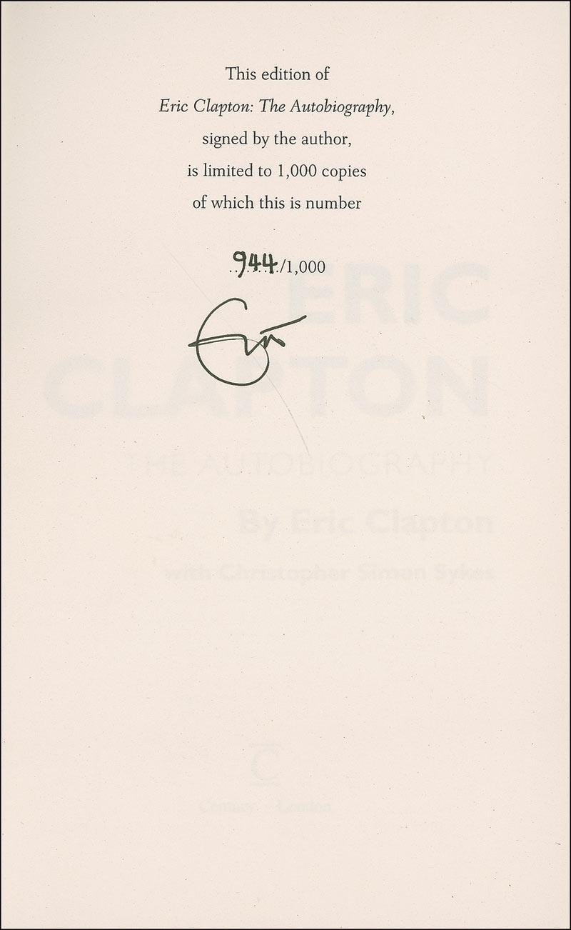 Signed book: Eric Clapton: The Autobiography. Limited first edition of 1,000 copies (this copy No. 944). London: Century, 2007. Hardcover with slipcase, 6.25 x 9.5, 392 pages. Signed in black ink on the limitation page. In fine condition.