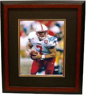 In 2001, Eric Crouch had his best year yet, breaking school or NCAA records almost weekly and appearing to be a serious contender for the Heisman Trophy. Crouch became only the fourth player in Division 1 history to both pass and rush for 3000 yards in a career. By mid-November, Crouch had set a school record for most career wins as a starter and became only the ninth quarterback in D-1A history to have won 35 games as a starter. Crouch was announced as the recipient of the Heisman Trophy award. His outstanding season was also recognized when he won the Davey O'Brien Award for being the best collegiate quarterback in the nation during the 2001 season. Eric Crouch has hand autographed this Nebraska Cornhuskers 8x10 Color Photo with 2001 Inscription. Custom Black Mat and Wood Color Framed as shown. GTSM Hologram and Certificate of Authenticity from Athlon Sports.