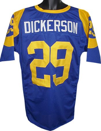 Eric Dickerosn was selected second overall in the 1983 NFL Draft by the Los Angeles Rams. An immediate pro success, he established rookie records for most rushing attempts (390), most rushing yards gained (1,808) and most touchdowns rushing (18), including another two receiving touchdowns. His efforts earned him All-Pro, Pro Bowl, Player of the Year and Rookie of the Year honors. In his sophomore season, Dickerson continued his onslaught of the NFL record book. Eleven times during that season he gained more than 100 yards rushing, breaking the record of 100-yard games in a season held by O.J. Simpson. His 2,105 total yards rushing in the 1984 NFL season beat Simpson’s 1973 NFL season record of 2003 yards rushing in a single season. This is an Eric Dickerson Los Angeles Rams unsigned Blue TB unlicensed custom-prostyle jersey with twill stitched nameplate and numbers. perfect for autograph or to wear! Size XL