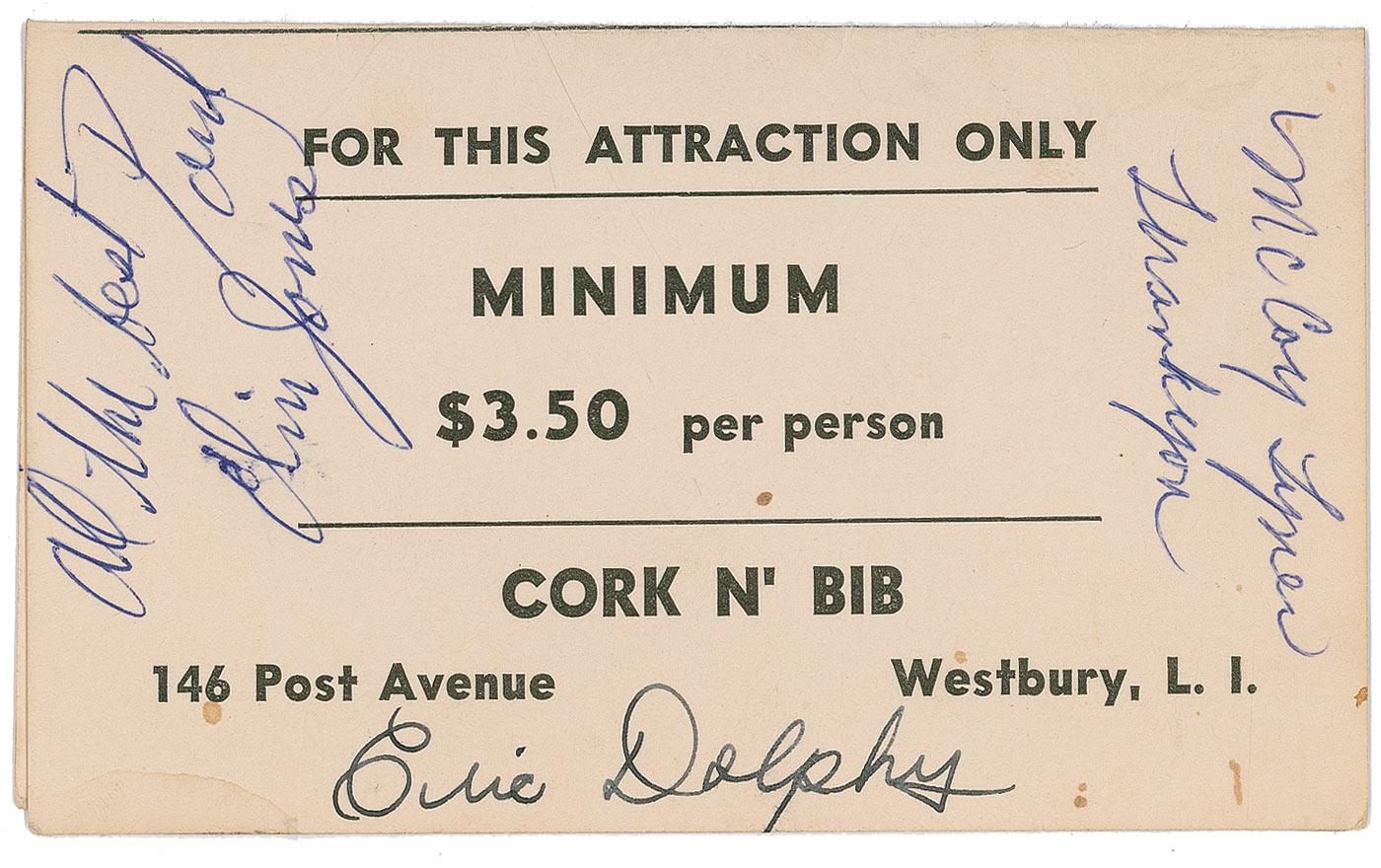 Regarded as a true original with his own distinctive styles on alto saxophone, flute, and bass clarinet, Dolphy died suddenly at the age of 36 from a diabetic coma. Table card from the Cork ‘n Bib in Westbury, Long Island, signed in-person in black ink by Dolphy, and also signed in-person in blue ballpoint by fellow John Coltrane band members McCoy Tyner, Elvin Jones, and Reggie Workman, who has signed on the opposite side and inscribed to Paul. In fine condition, with some scattered light soiling. Signed during the brief period when Dolphy joined Coltrane's usual quartet.