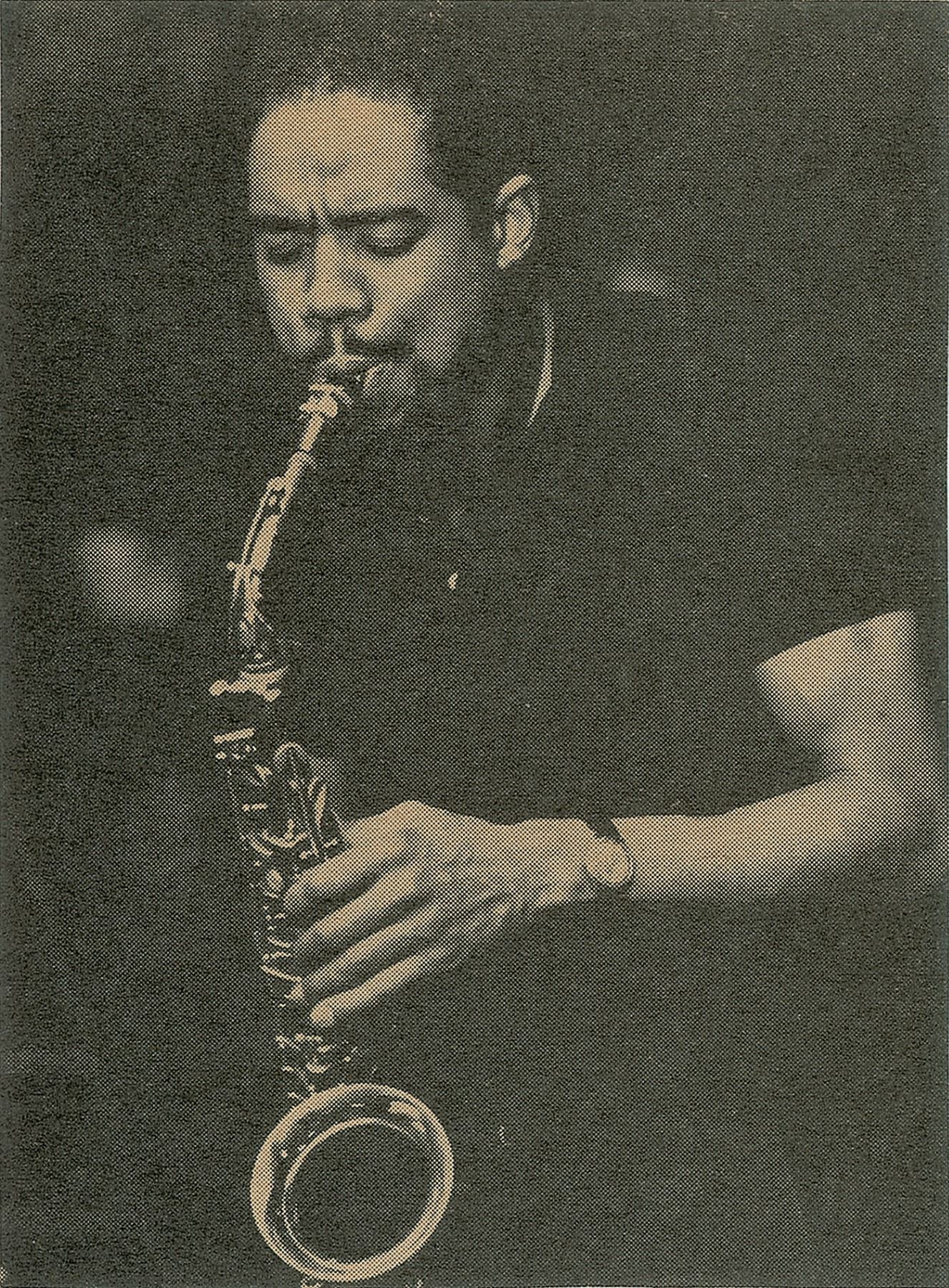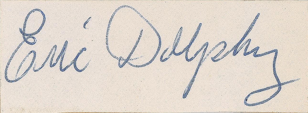 Innovative jazz alto saxophonist, flautist, and bass clarinetist (1928–1965) who died suddenly at the age of 36 from a diabetic coma. Uncommon vintage ballpoint signature, "Eric Dolphy,” on a small off-white 2.25 x .75 slip. In fine condition. Accompanied by a newspaper photo of Dolphy plating his saxophone.