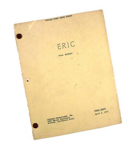 Eric First Draft Production Teleplay - Original First Draft production teleplay of "Eric" (1975), the award-winning groundbreaking true story of a young athlete with leukemia who refuses to give up, and in so doing inspires everyone around him. With an amazing cast that went on to major roles including Mark Hamill and John Savage as Eric. (Approx. 11" x 8 1/2").