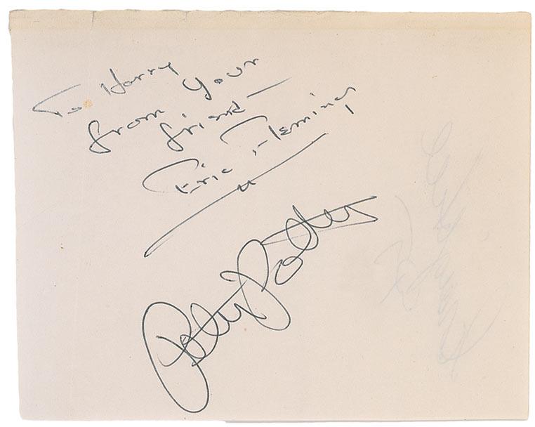 American actor (1925–1966), best known as the trail boss Gil Favor on the popular TV series Rawhide, who drowned at the age of 42 while filming a television pilot in Peru. Ballpoint signature, “For Harry from your friend—Eric Fleming,” on an off-white 5.25 x 4.25 album page. Also signed by Peter Potter at the bottom of the page. Vertical crease along the left side affecting part of his inscription, wrinkling, a couple tiny tears at the top border with a strip of toning, and show-through from the signature of actor Craig Hill on the reverse, otherwise fine condition.
