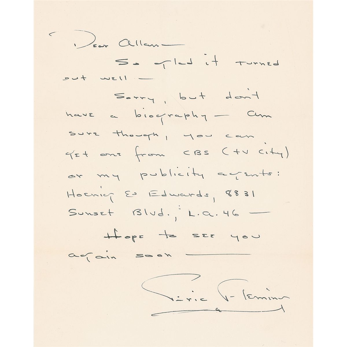 American actor (1925–1966), best known as the trail boss Gil Favor on the popular TV series Rawhide, who drowned at the age of 42 while filming a television pilot in Peru. ALS, one page, 8 x 10, no date. In part: “Sorry, but don’t have a biography—am sure though, you can get one from CBS (TV City) or my publicity agents.” In fine condition, with intersecting folds.