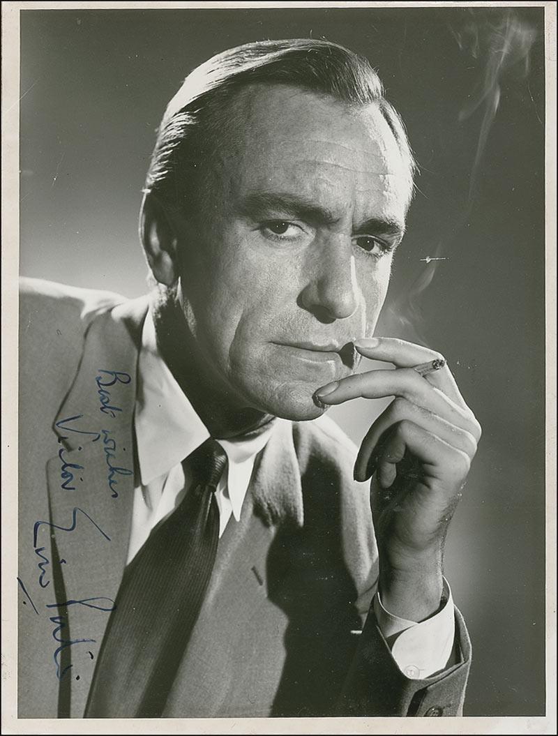 British actor (1928-1995) best known for playing Dr. Moriarty opposite Jeremy Brett’s Sherlock Holmes and Soames Forsyte in the 1967 oft-rescreened 26-part BBCTV production of The Forsyte Saga by John Galsworthy. Vintage glossy 6.5 x 8.5 photo of Porter holding a cigarette, signed and inscribed in fountain pen “Best wishes Victor, Eric Porter.” In very good condition, with scattered creases and surface marks, lightly trimmed top edge, and old tape to edges on reverse.