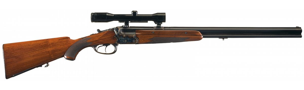 Refinished, the barrels retain 80% of the high quality blue finish with scattered light scratches, dings and minor pitting. There is oxidation on the top right side of the rifle barrel where it has been resoldered in place and there are some wrinkles in the barrel at the same spot. The rifle barrel has been sleeved. The shotgun barrel has some scattered dings on the left side that are visible in the bore. The casehardened components retain nearly all of the high quality case colors with only minor wear. The wood is very good as refinished with a small filler repair, two small repaired hairline cracks on each side of the wrist and some dark areas. Mechanically excellent. The scope is excellent with clear optics.
