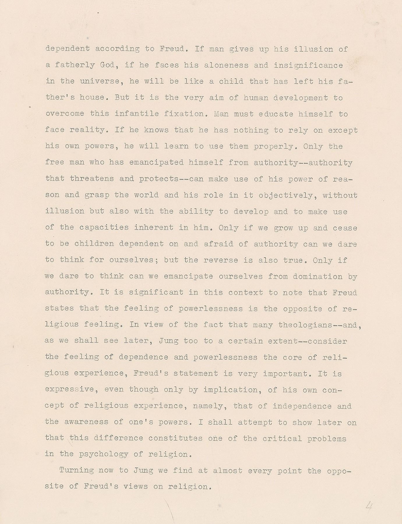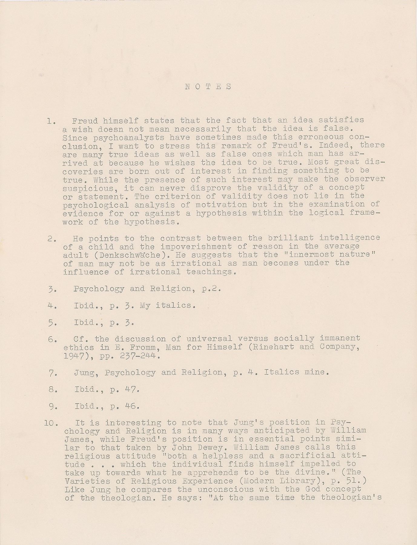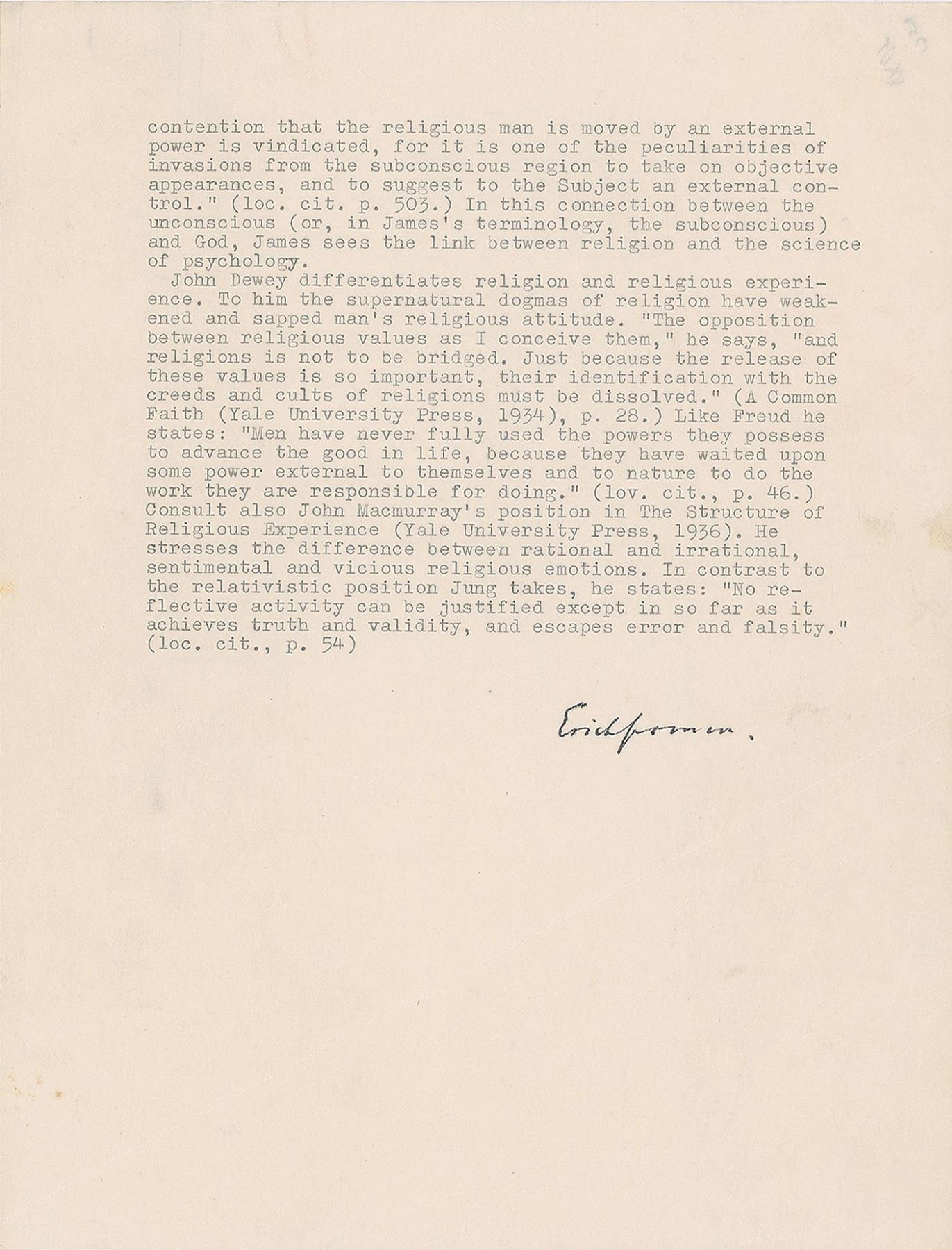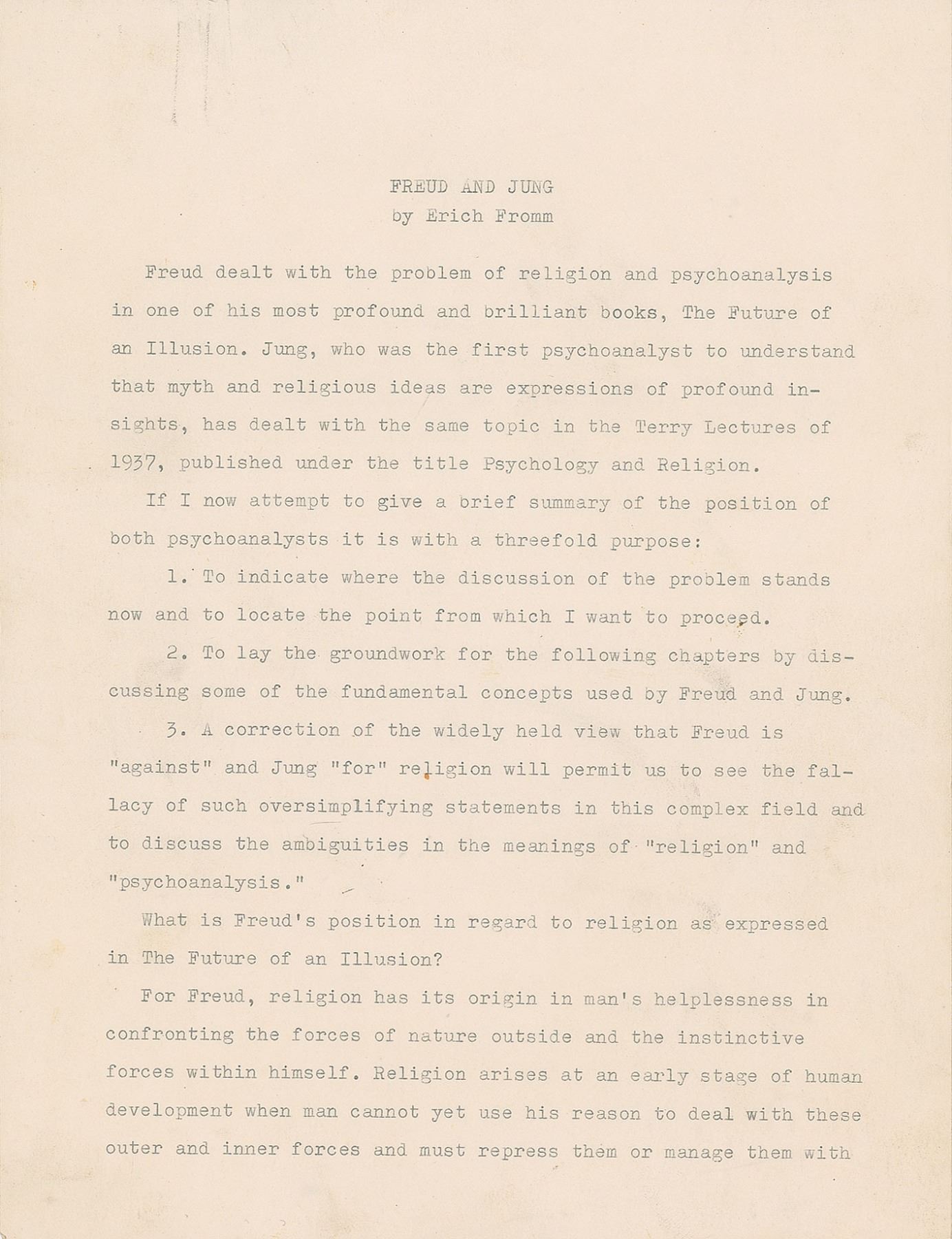 Typescript of a chapter from Erich Fromm's 1950 book Psychoanalysis and Religion, entitled "Freud and Jung," ten pages, 8.25 x 11, with additional two-page "Notes" section signed at the conclusion in black ballpoint by Fromm. The article, in part: "Freud dealt with the problem of religion and psychoanalysis in one of his most profound and brilliant books, The Future of an Illusion. Jung, who was the first psychoanalyst to understand that myth and religious ideas are expressions of profound insights, has dealt with the same topic in the Terry Lectures of 1937, published under the title Psychology and Religion. If I now attempt to give a brief summary of the position of both psychoanalysts it is with a threefold purpose: 1) To indicate where the discussion of the problem stands now and to locate the point from which I want to proceed. (2) To lay the groundwork for the following chapters by discussing some of the fundamental concepts used by Freud and Jung. (3) A correction of the widely held view that Freud is 'against' and Jung 'for' religion will permit us to see the fallacy of such oversimplifying statements in this complex field and to discuss the ambiguities in the meanings of 'religion' and 'psychoanalysis.'" In fine condition, with light creasing and paperclip impressions.