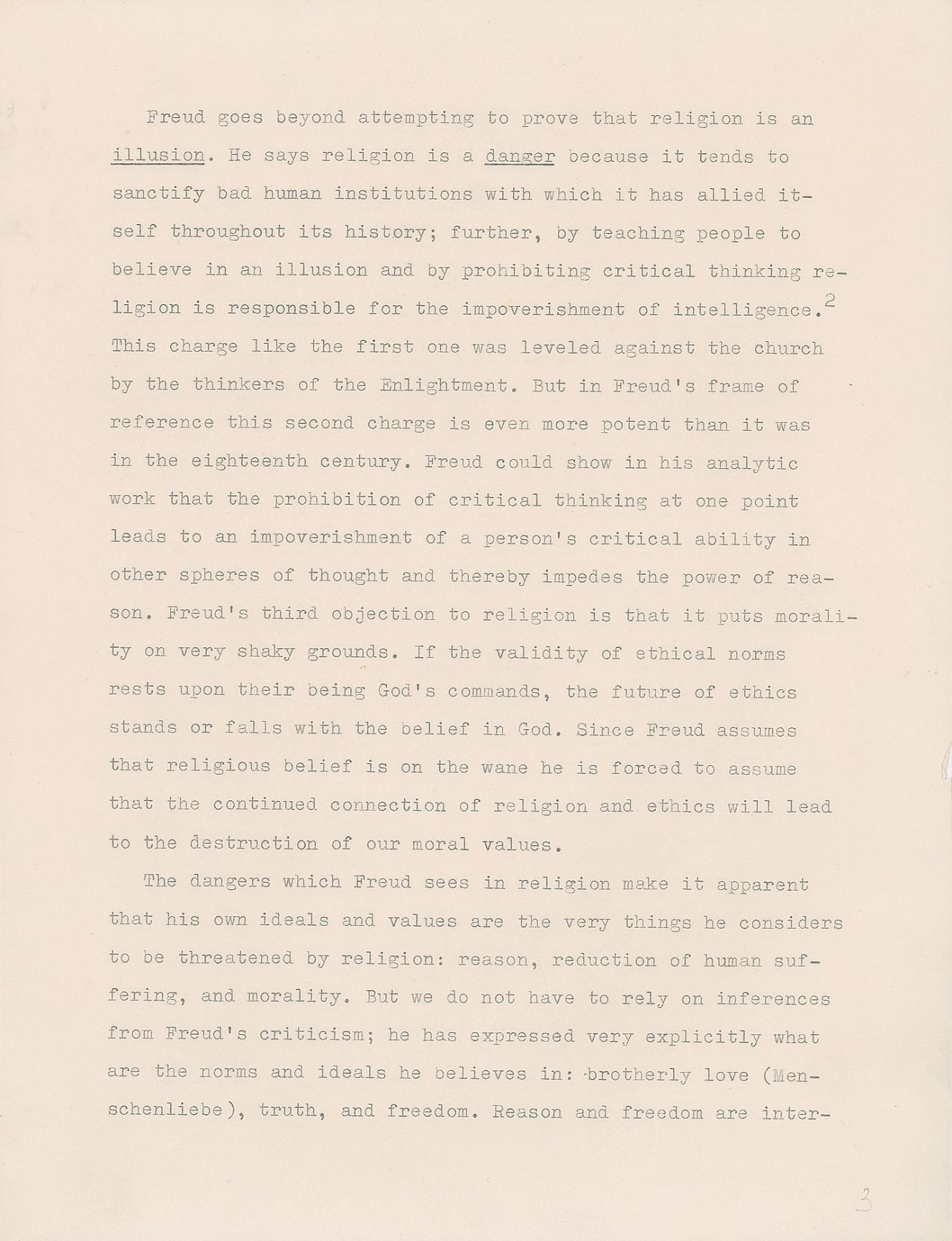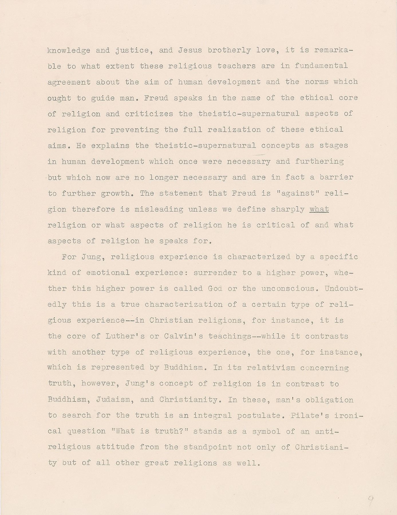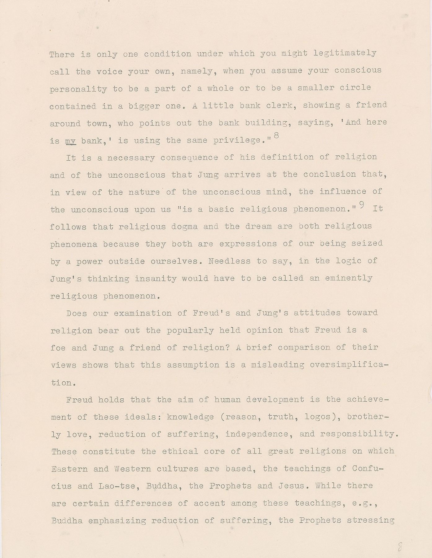 Typescript of a chapter from Erich Fromm's 1950 book Psychoanalysis and Religion, entitled "Freud and Jung," ten pages, 8.25 x 11, with additional two-page "Notes" section signed at the conclusion in black ballpoint by Fromm. The article, in part: "Freud dealt with the problem of religion and psychoanalysis in one of his most profound and brilliant books, The Future of an Illusion. Jung, who was the first psychoanalyst to understand that myth and religious ideas are expressions of profound insights, has dealt with the same topic in the Terry Lectures of 1937, published under the title Psychology and Religion. If I now attempt to give a brief summary of the position of both psychoanalysts it is with a threefold purpose: 1) To indicate where the discussion of the problem stands now and to locate the point from which I want to proceed. (2) To lay the groundwork for the following chapters by discussing some of the fundamental concepts used by Freud and Jung. (3) A correction of the widely held view that Freud is 'against' and Jung 'for' religion will permit us to see the fallacy of such oversimplifying statements in this complex field and to discuss the ambiguities in the meanings of 'religion' and 'psychoanalysis.'" In fine condition, with light creasing and paperclip impressions.