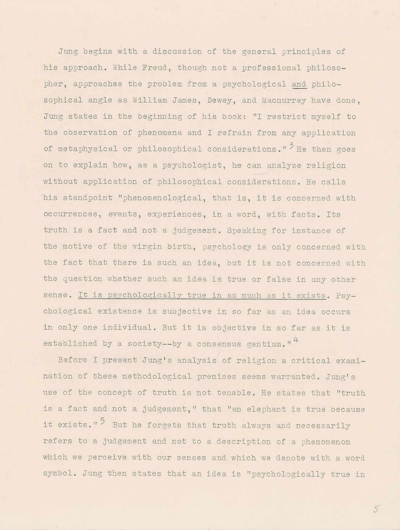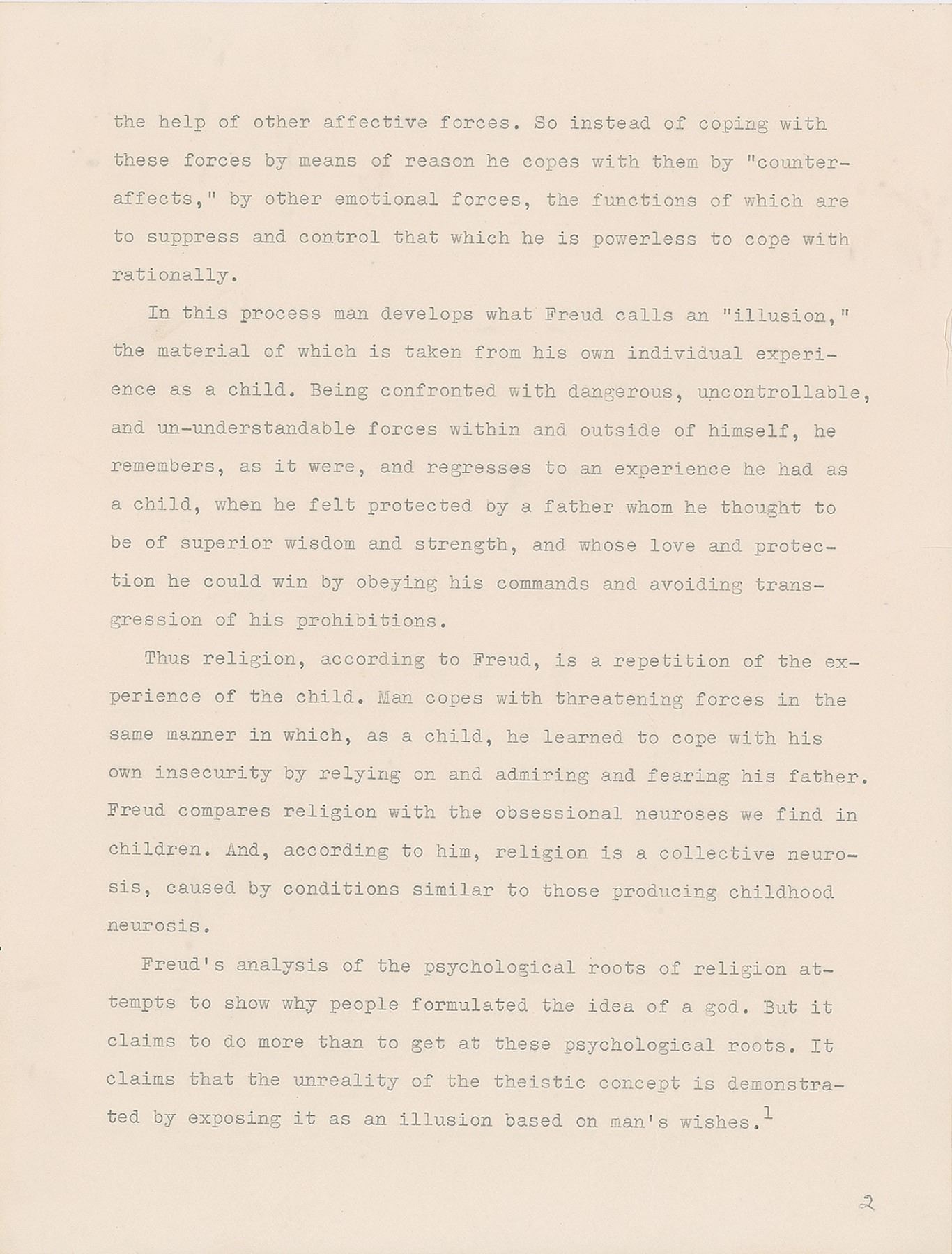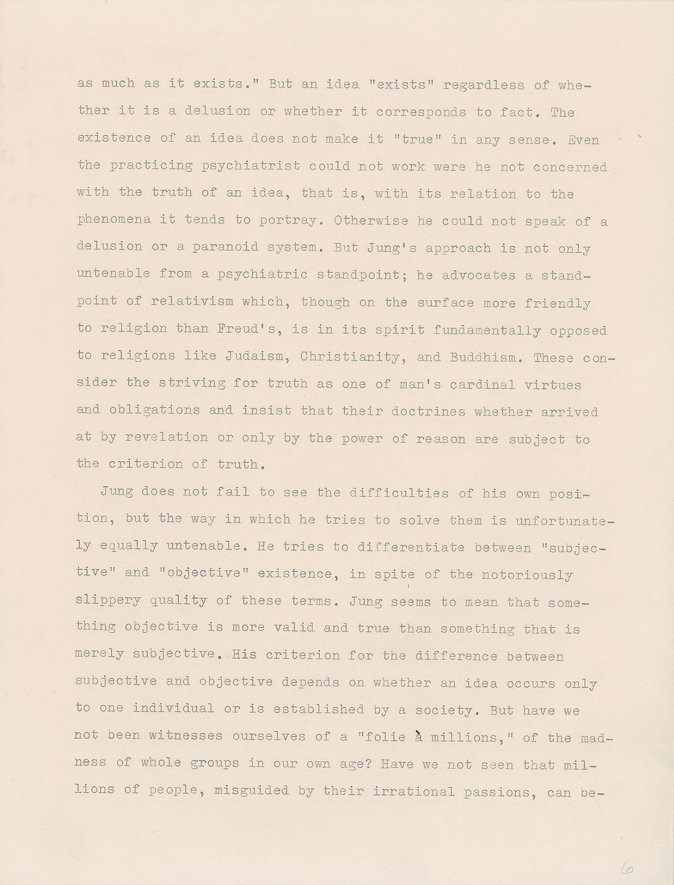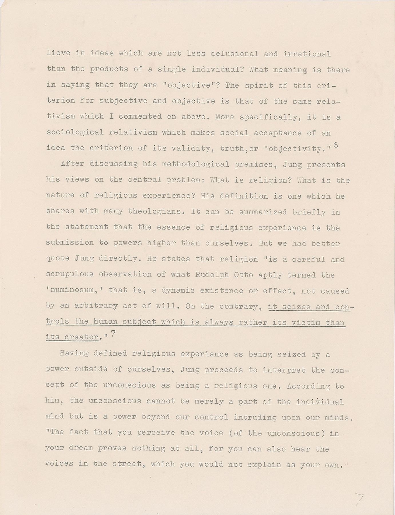 Typescript of a chapter from Erich Fromm's 1950 book Psychoanalysis and Religion, entitled "Freud and Jung," ten pages, 8.25 x 11, with additional two-page "Notes" section signed at the conclusion in black ballpoint by Fromm. The article, in part: "Freud dealt with the problem of religion and psychoanalysis in one of his most profound and brilliant books, The Future of an Illusion. Jung, who was the first psychoanalyst to understand that myth and religious ideas are expressions of profound insights, has dealt with the same topic in the Terry Lectures of 1937, published under the title Psychology and Religion. If I now attempt to give a brief summary of the position of both psychoanalysts it is with a threefold purpose: 1) To indicate where the discussion of the problem stands now and to locate the point from which I want to proceed. (2) To lay the groundwork for the following chapters by discussing some of the fundamental concepts used by Freud and Jung. (3) A correction of the widely held view that Freud is 'against' and Jung 'for' religion will permit us to see the fallacy of such oversimplifying statements in this complex field and to discuss the ambiguities in the meanings of 'religion' and 'psychoanalysis.'" In fine condition, with light creasing and paperclip impressions.
