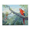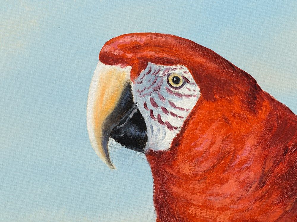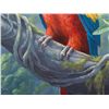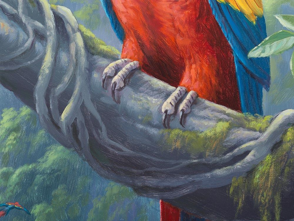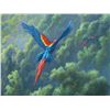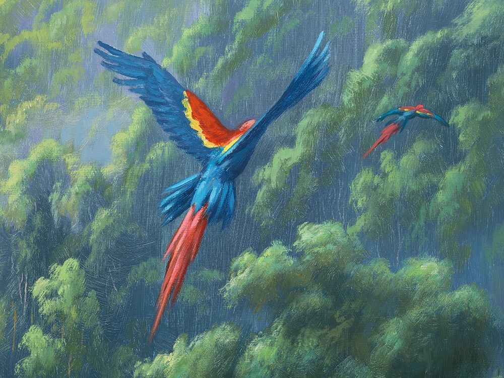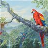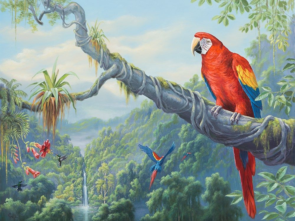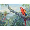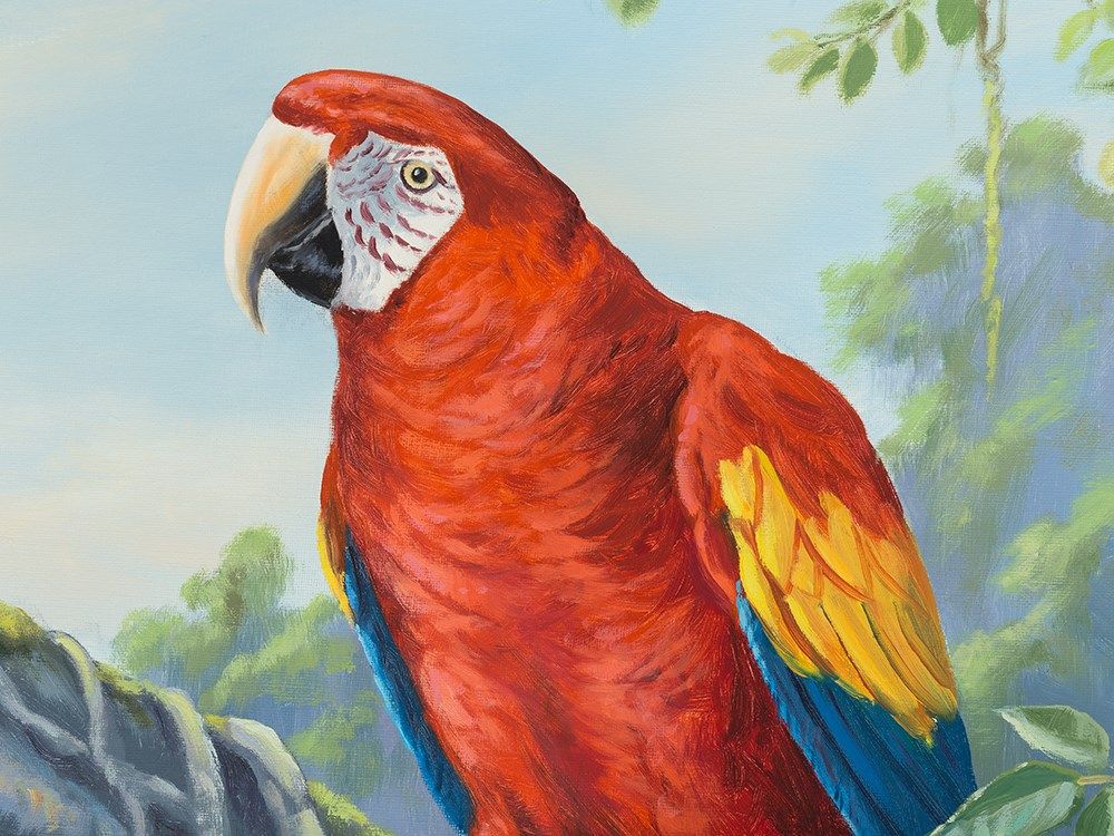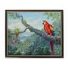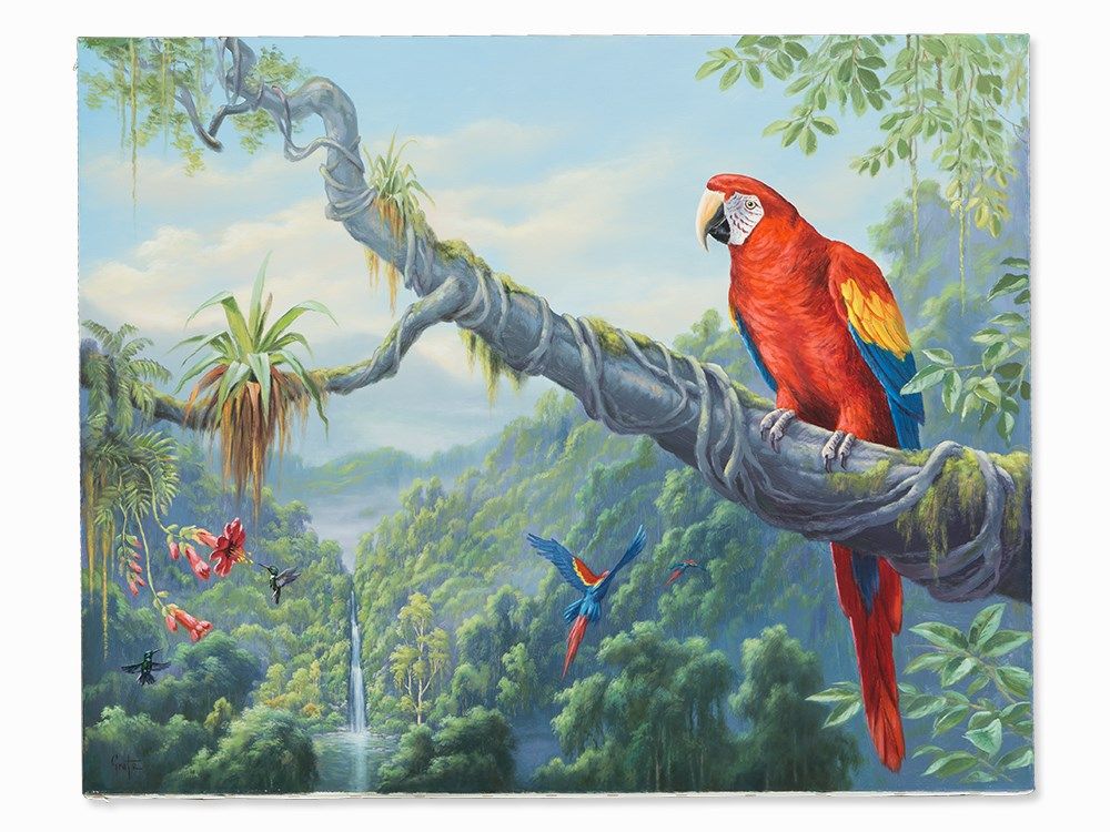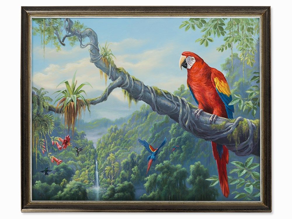 The present painting is a work by the German artist Erich Graf and dates back to the time around 2000. It depicts an Ara sitting on a tree which is located in the scenery of the rainforest. He is accompanied by his conspecifics in the background.