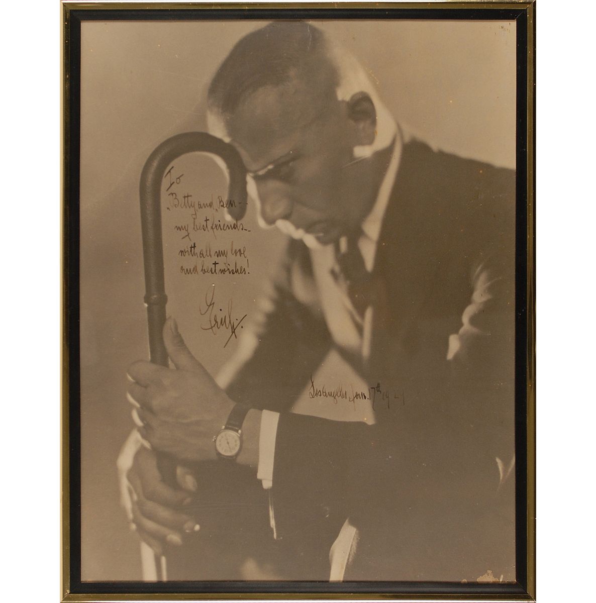 Outstanding vintage matte-finish 10 x 13 photo of von Stroheim leaning against a cane, signed and inscribed in fountain pen “To Betty and Ben—my best friends—with all my love and best wishes! Erich, Los Angeles, Jan. 17th 1929.” In very good condition, with light scattered soiling and surface impressions, and some staining to the lower right corner.