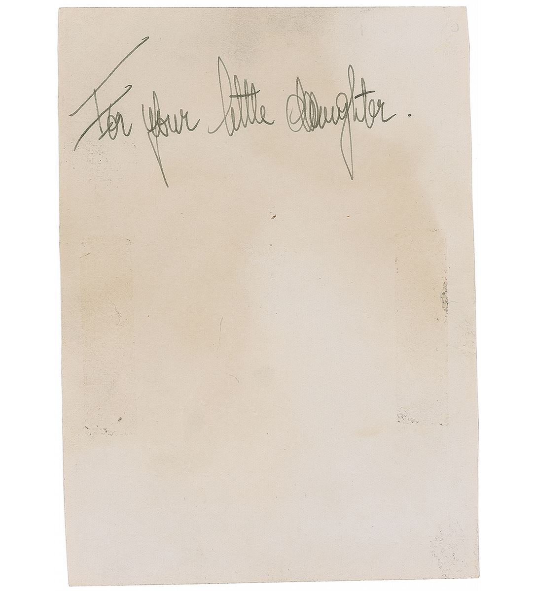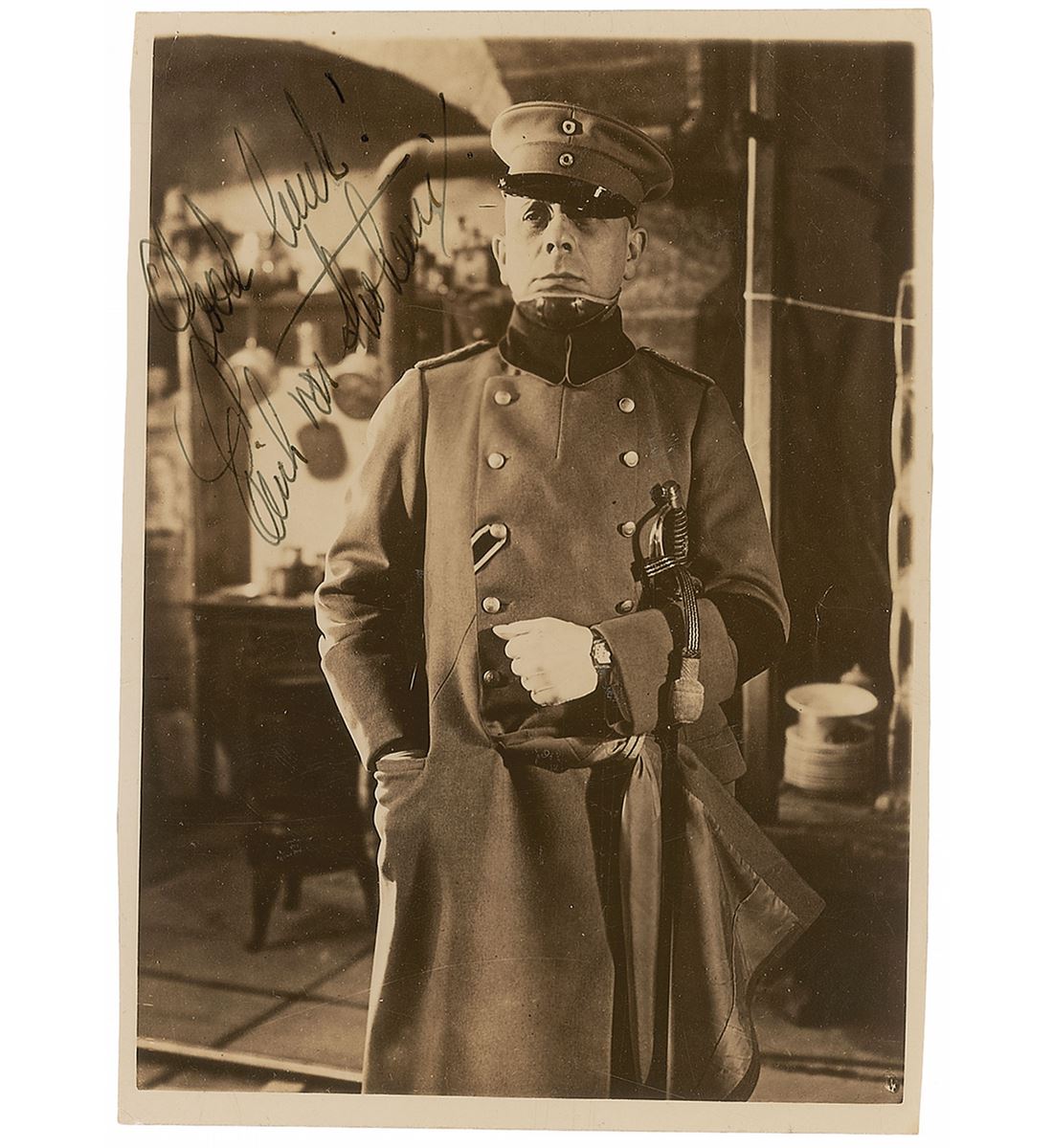 Vintage glossy 4 x 5.5 photo of von Stroheim as Captain von Rauffenstein in the 1937 film La Grande Illusion, signed on the front in fountain pen, “Good luck! Erich von Stroheim,” and inscribed on the reverse, “For your little daughter.” Trimmed edges, crazing to emulsion, and slight show-through from inscription to reverse, otherwise fine condition.