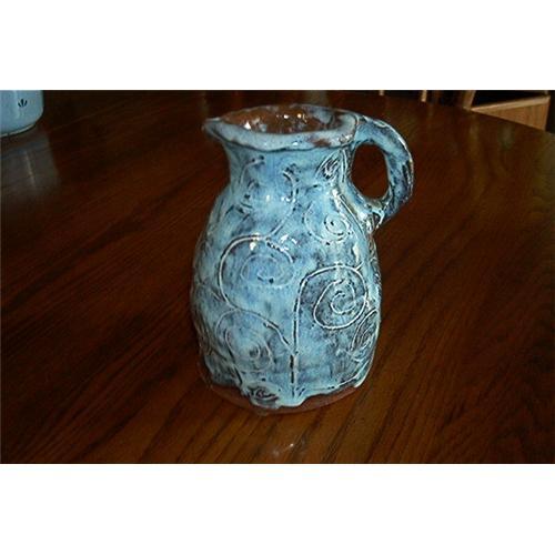 Beautiful, highly glazed clay pottery creamer. It is blue/grey in color with large swirls decorating the entire creamer with some of the red clay showing. Bottom is engraved C. ERICKSON. The inside is also glazed in pale blue. This ERICKSON Clay pottery creamer measures 6 1/4 inches tall; opening diameter measures 2 3/4 inches; base diameter measures 4 1/8 inches; Inside depth measures 5 7/8 inches. Thickness measures 1/4 inch. There is a small chip on the top rime, otherwise in very good to excellent condition.