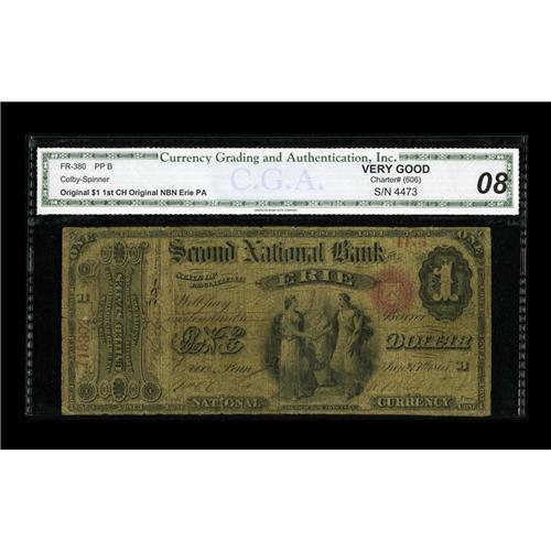 <B>Erie, PA</B></I> - $1 Original Fr. 380 <B>The Second NB</B></I> Ch. # 606<BR>This is only the third Ace reported on this bank. Graded <B>CGA Very Good 8</B></I> it is dark with some paper compromises.