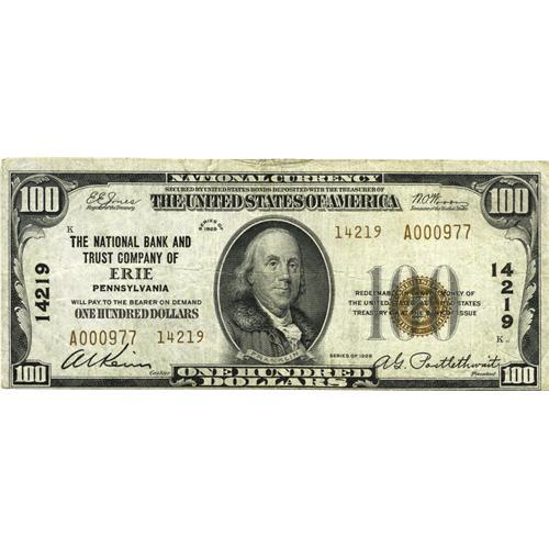 <B>Erie, PA</B></I> - $100 1929 Ty. 2 <B>The NB & TC</B></I> Ch. # 14219<BR>A scarce type and denomination from any bank, with this example a new addition to the census from here. <B>Fine+,</B></I> with the bottom margin trimmed very tightly.