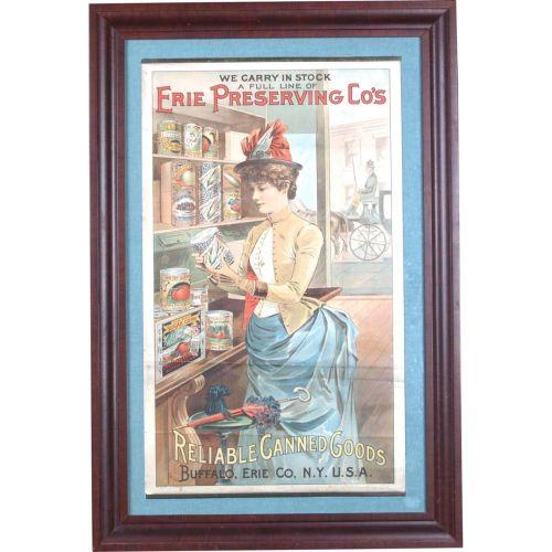 Erie Preserving Co Reliable canned Goods paper ad with metal strips top & bottom c 1880 Calvert Litho Co. Detroit framed 18" x27"