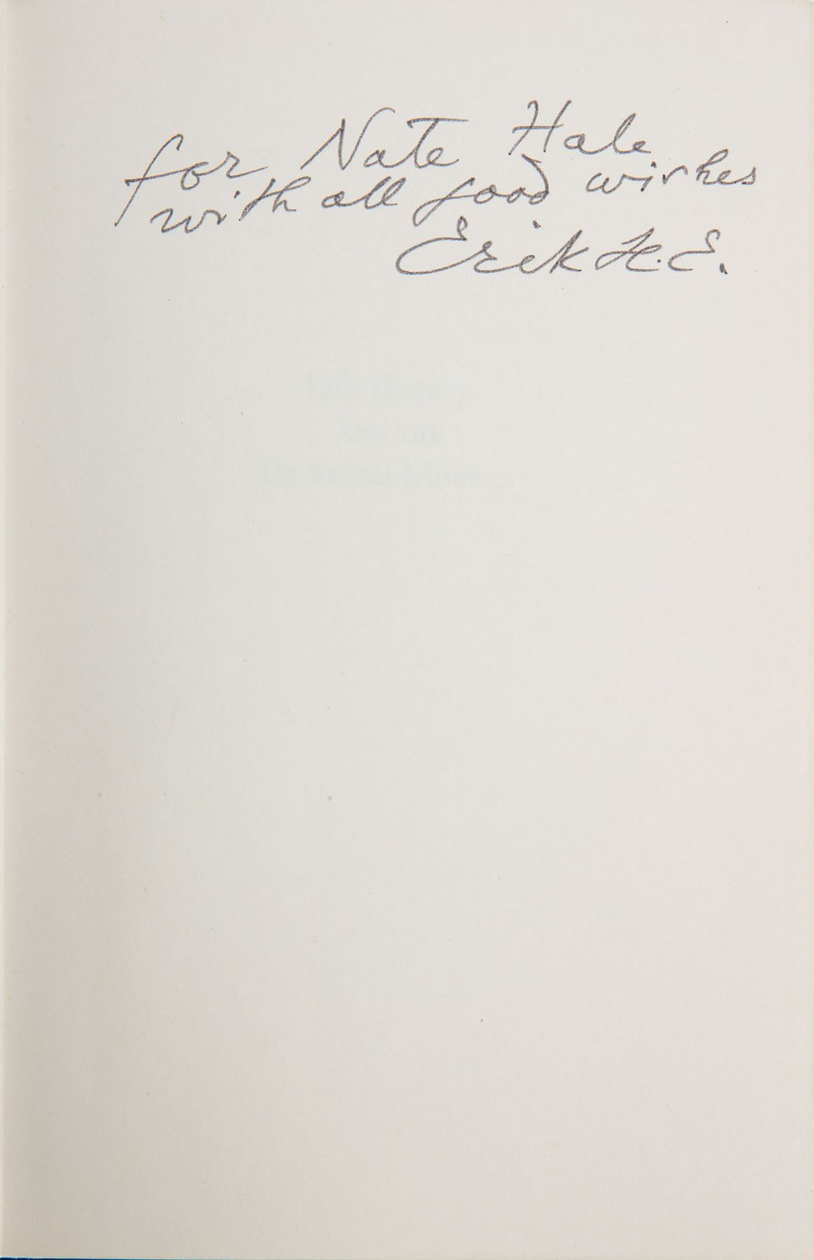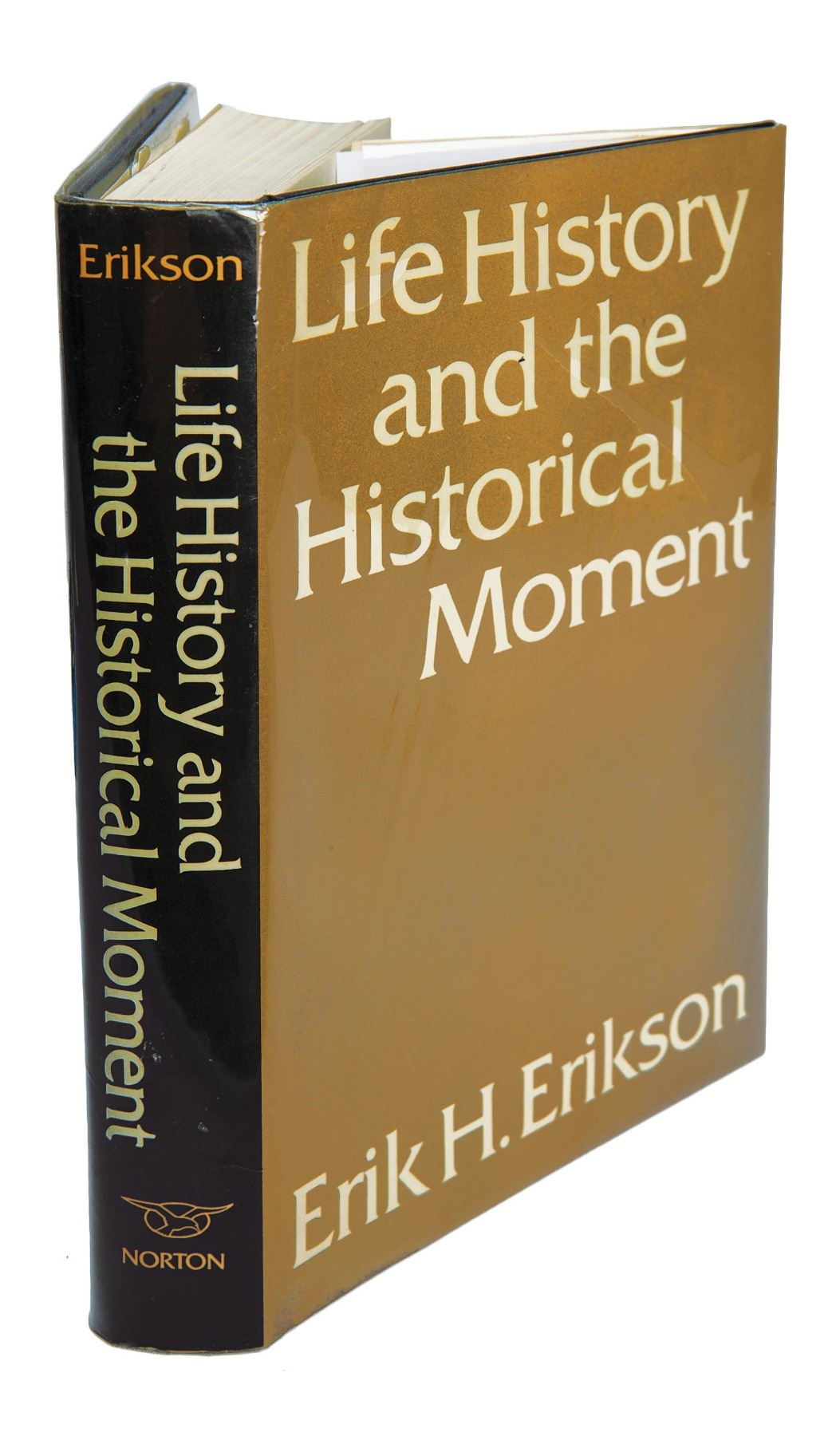 Psychologist (1902–1994) known for his theories on human development and coining the term 'identity crisis.' Signed book: Life History and the Historical Moment. First edition, second printing. NY: W. W. Norton, 1975. Hardcover with dust jacket, 5.75 x 8.5, 283 pages. Signed and inscribed on the first free end page in black felt tip, "For Nate Hale, with all good wishes, Erik H. E." In fine condition.