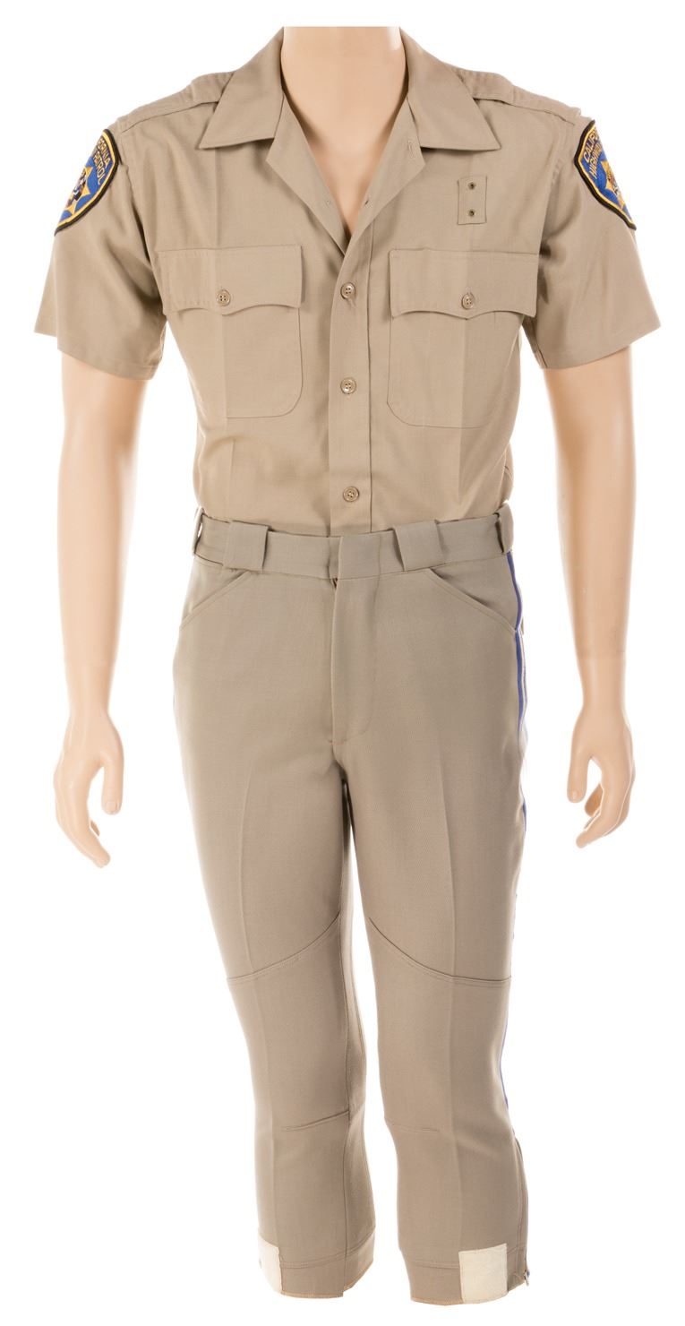 143. Erik Estrada "Officer Frank Poncherello" police uniform from CHiPs. (NBC, 1977-83) Vintage original (2) piece uniform including (1) Louis the Tailor Inc. brand short sleeve khaki cotton shirt with pointed collar, epaulets, 2-chest flap pouch pockets, 2-embroidered "California Highway Patrol" applique patches on shoulders, added button front crotch panel, with hidden zipper and button front closure, retaining external Metro Goldwyn-Mayer bias label handwritten, "EE" in black ink, and (1) pair matching thick wool trousers with blue and yellow knit striped panels down sides of legs, white elastic legs stirrups, retaining internal Metro Goldwyn-Mayer bias label handwritten, "EE" in black ink. Exhibiting light production wear. In vintage very good to fine condition. $1,500 - $2,500