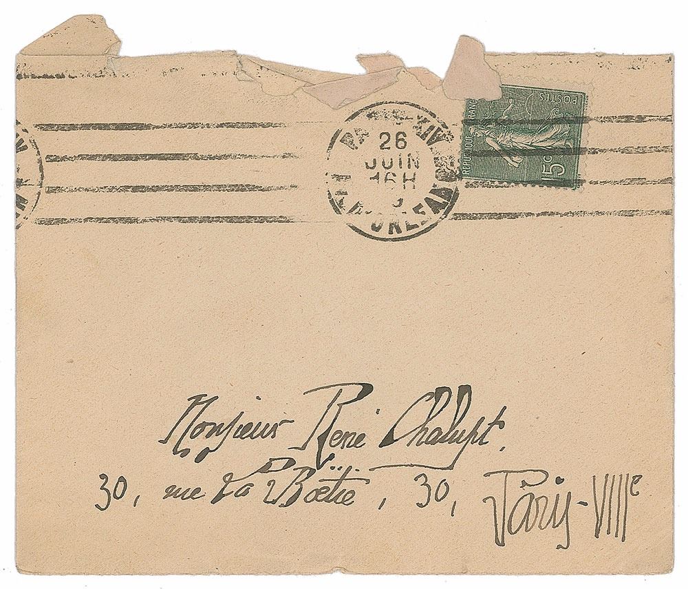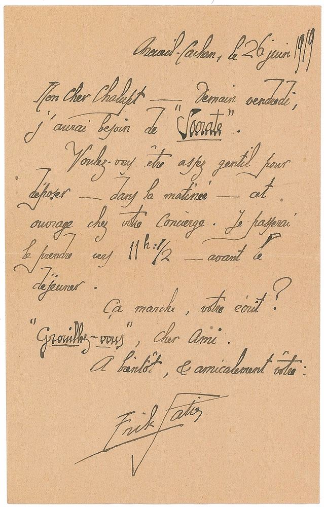 ALS in French, one page, 4.25 x 6.75, June 26, 1919. Letter to his friend, the poet Rene Chalupt, in part (translated): "Tomorrow, Friday, I will need 'Socrate.' Do you want to be kind enough to drop it off—in the morning—this book with your concierge." In fine condition. Accompanied by the original mailing envelope addressed in Satie's hand. Satie asked Chalupt to write the preface for his work 'Socrate,' a symphonic drama for voice and piano published in 1919.